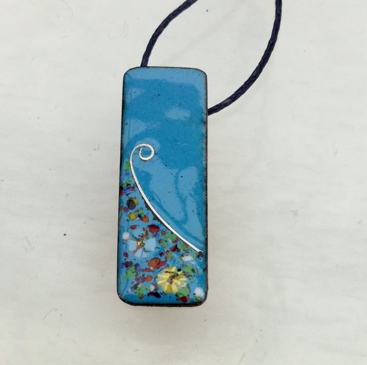 This delightful pendant measures approx. 12mm wide x 35mm long. I have made it from copper, kiln-fired a base coat, fired, added flowers, fired, fused sterling silver wire design, fired, then added enamel crystals and last firing. After soldering an attachment for chain or waxed cotton thread, this piece has been highly polished and I've included a long length of waxed cotton thread for you to tie at any length you desire.....voila! It also arrives in a gift box.