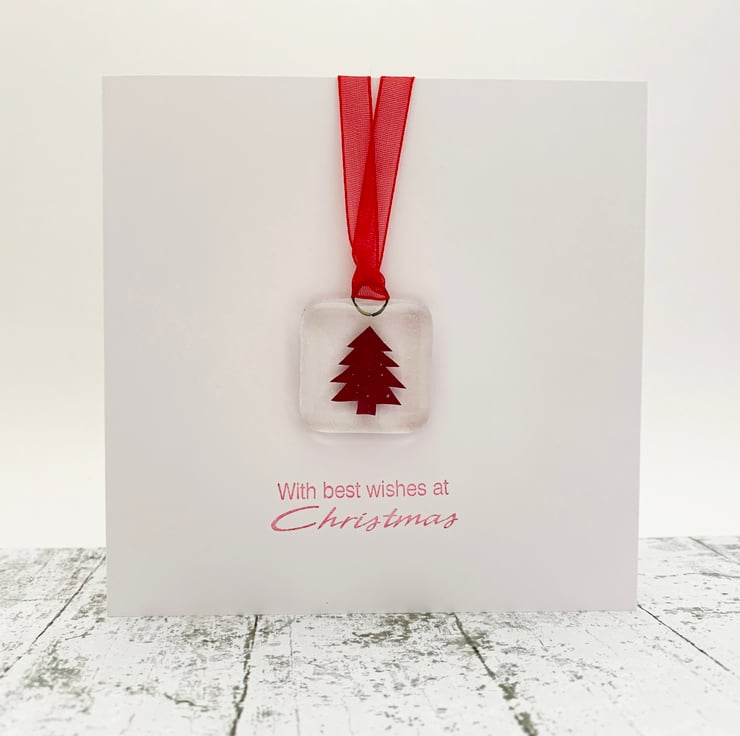 Handmade card featuring a keepsake fused glass Christmas tree suncatcher.