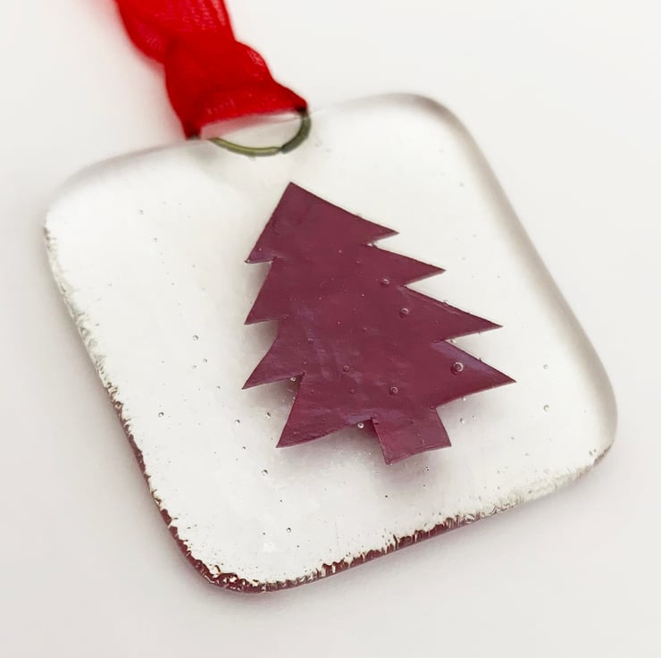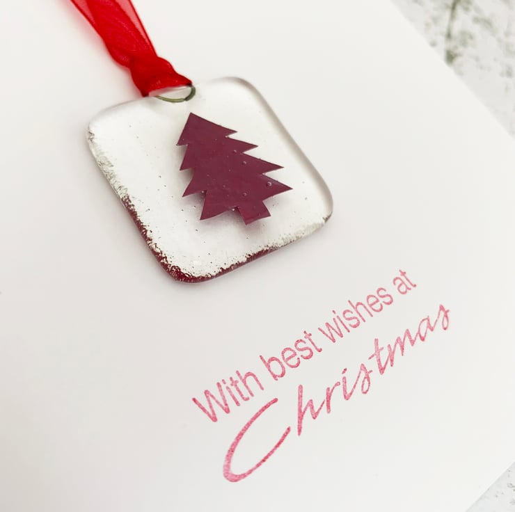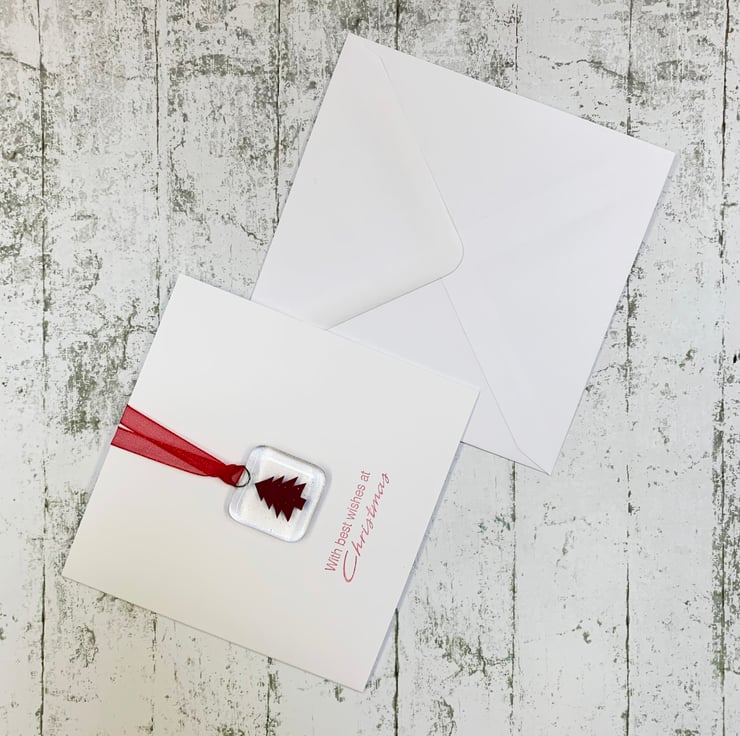 To make the glass suncatcher, I started by cutting Christmas tree shapes out of very thin copper foil, using a scalpel. Then I cut 2 squares from transparent art glass. The foil is sandwiched between the 2 layers of glass and fused overnight in my kiln. When it's fired in my kiln, the copper turns to a lovely deep red colour. When cooled, I added a red ribbon and attached the suncatcher to a handstamped card, featuring the words "With best wishes at Christmas." The card is left blank inside for your own message. Card comes with envelope in a plastic wrapping.