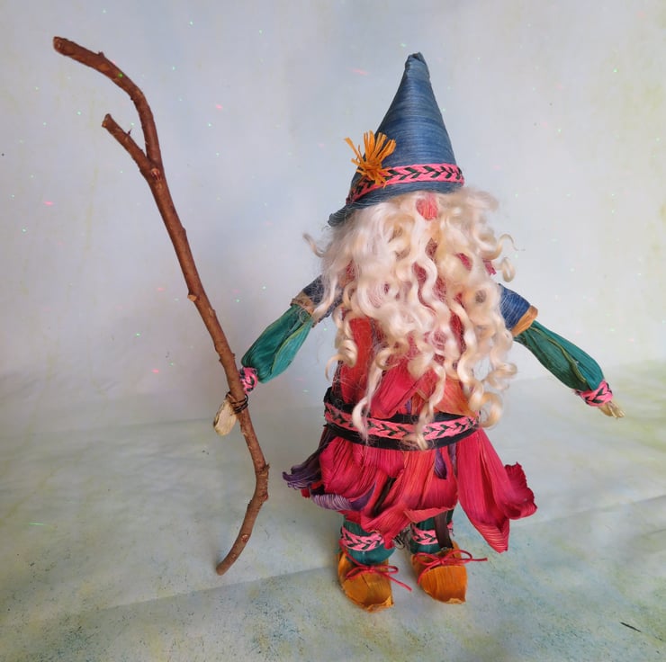He has sheepwool hair and beard and has some internal wiring so the legs and arms can be slightly bend and would make an ideal window or shelf ornament. He is not a toy however as long as they are kept away from damp envoronments husk dolls can last an awful long time and many are displayed in museums.