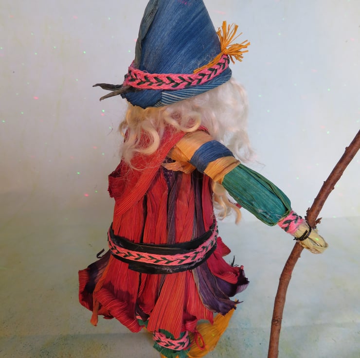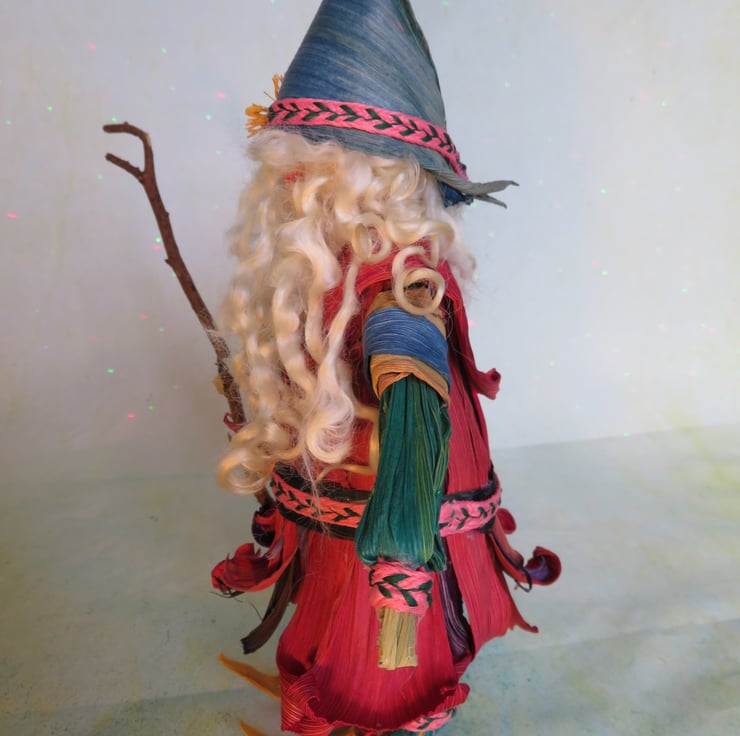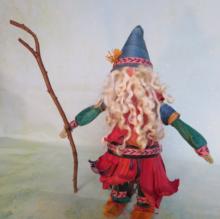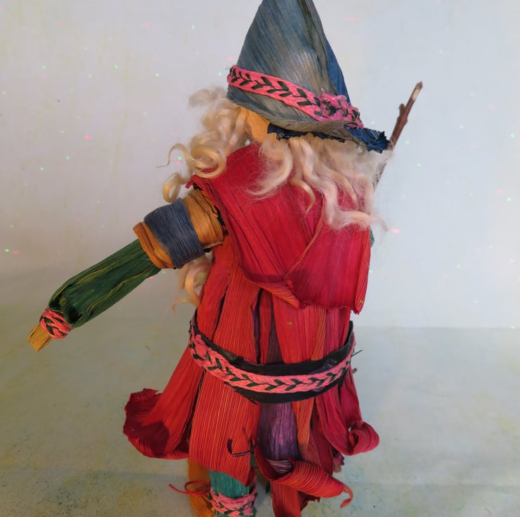 Father Xmas made out of corn husks standing approximately 10 and a half inches to the top of his hat. I like to imagine him wandering the forests with his elves and freinds looking for xmas leaves and berries to adorn his toy shop. Maybe I imagine too much but I guess thats what he is for, to bring the imagination to life.