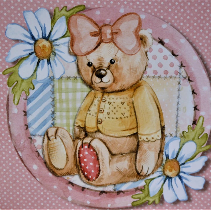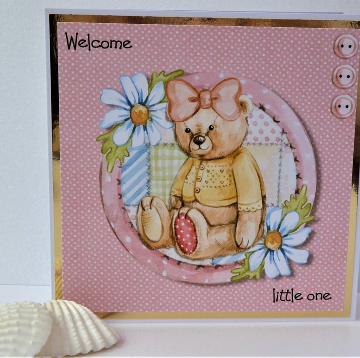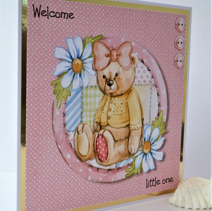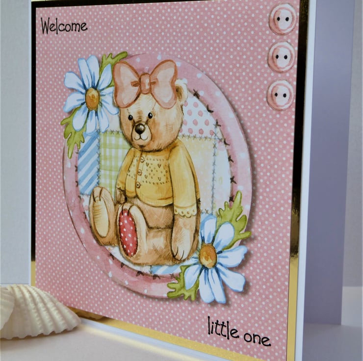 This card has been made from 300 gsm white card. The image has been layered up onto gold mirri card. A lovely card for a new arrival.