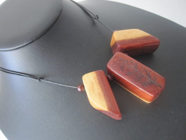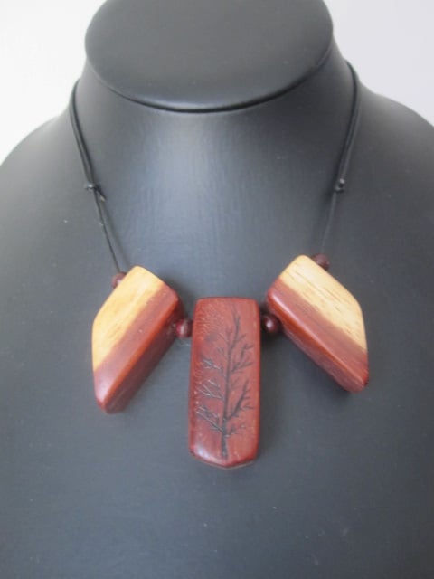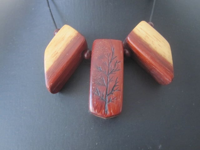 A pendant made using Padouk wood. It consists of 3 pieces of Padouk wood along with 4 small round coconut beds. Padouk wood originates from Africa and Asia and can be bright red/orange in colour through to a warm brown. The components are threaded together with black leather thong which has sliding knots to let the length be adjustable. As there is plenty of length to work with, the leather thong can be altered by the wearer to have a catch or permanent knot, which ever the wearer prefers. This particular pendant has a tree design burnt on in the center section. The pendant will come in an organza bag.