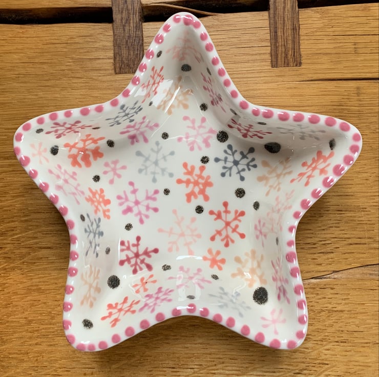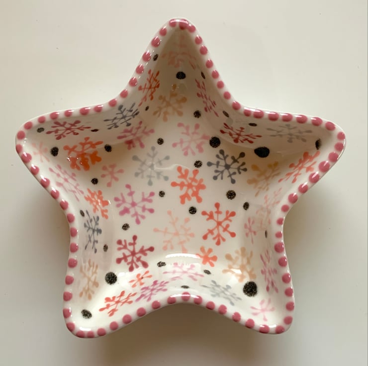 These cute star shaped dishes are made from white earthenware. Each star dish is hand painted with a range of icy coloured snowflakes in vivid pastel underglazes. These are accentuated with glitter glaze dots.