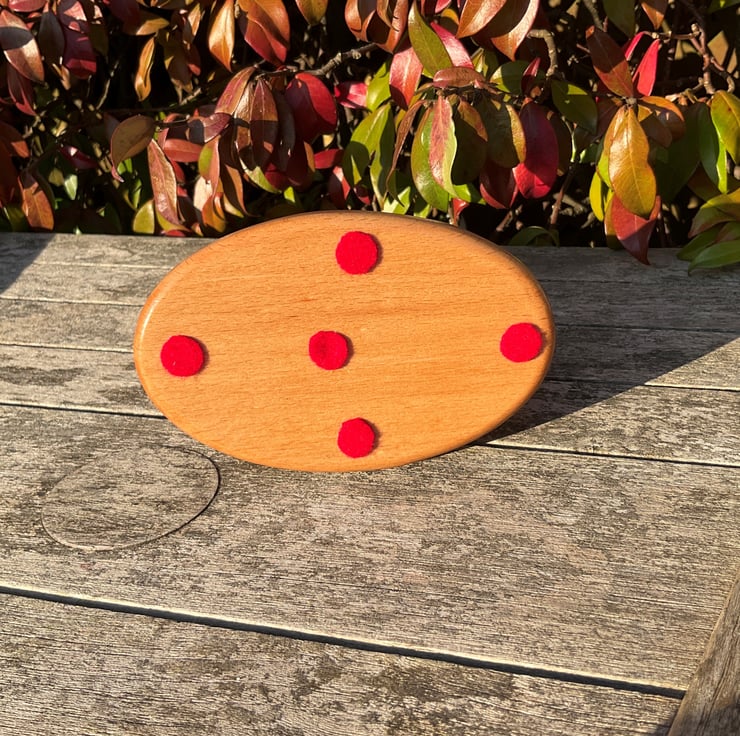 The stand is made from beech wood with contrasting walnut ears. All the edges are rounded & smoothed, the stand finished to a deep satin sheen which is very tactile. The base underside is fitted with contrasting red felt pads to minimise scratching.