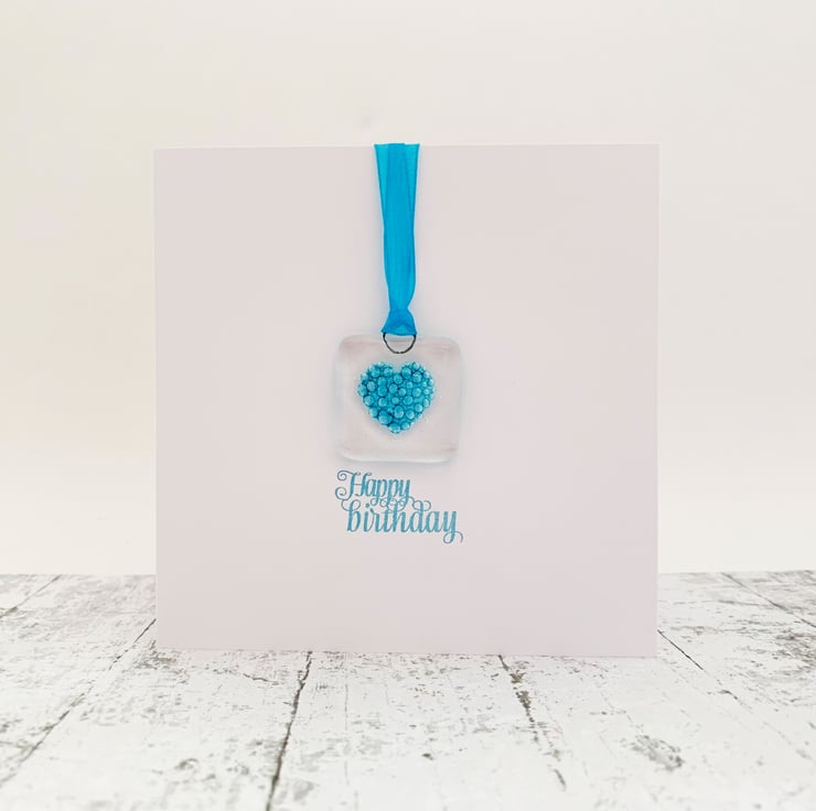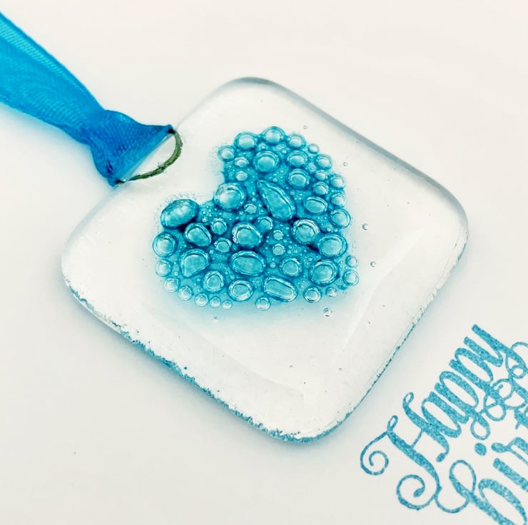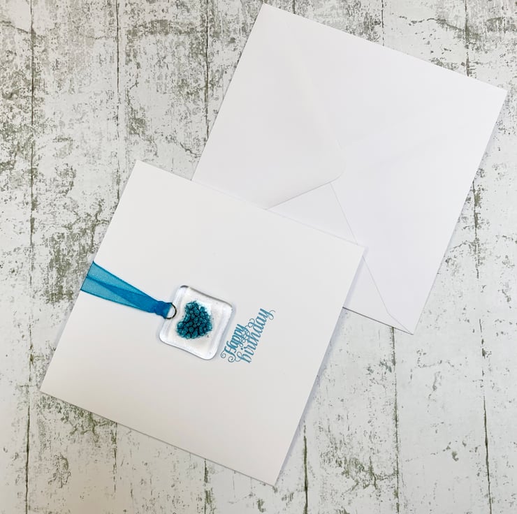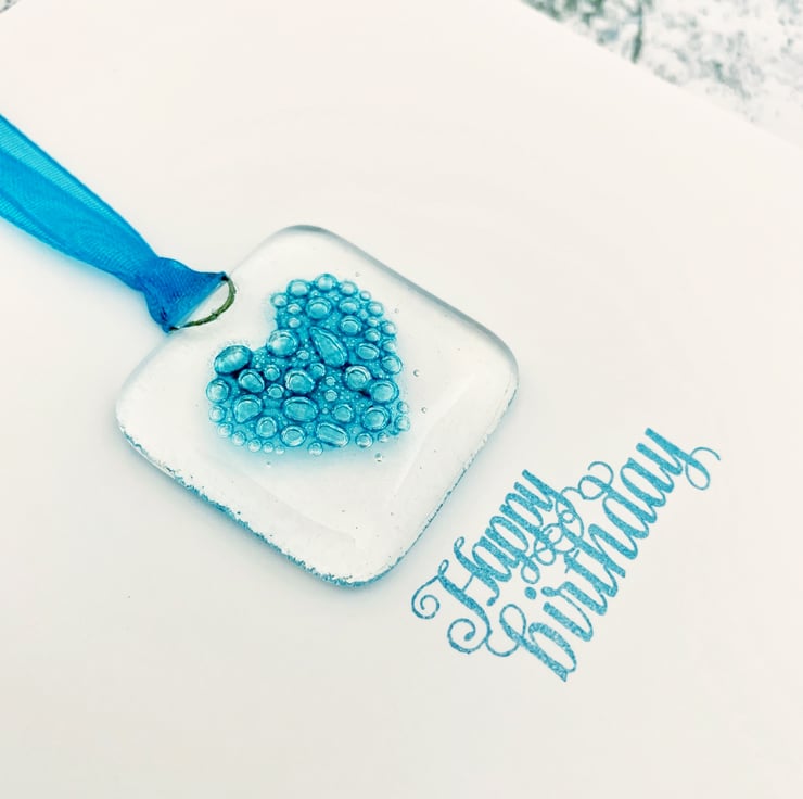 To make the glass suncatcher, I started with cutting 2 squares from transparent art glass. I then used specialist glass paint to hand paint a little heart on one of the squares. I then capped it with the other square and fused it overnight in my kiln. When it's fired, the paint turns into lots of tiny turquoise bubbles. When cooled, I added a turquoise ribbon and attached the suncatcher to a handstamped card, featuring the words "Happy birthday." The card is left blank inside for your own message. Card comes with envelope in a plastic wrapping.