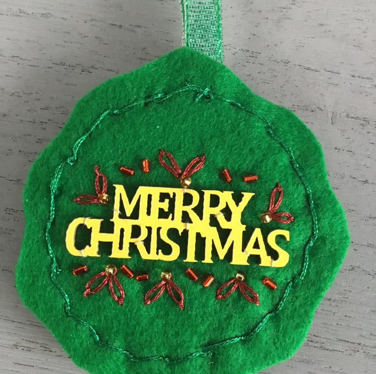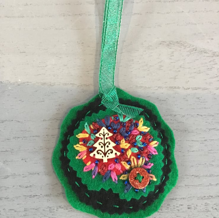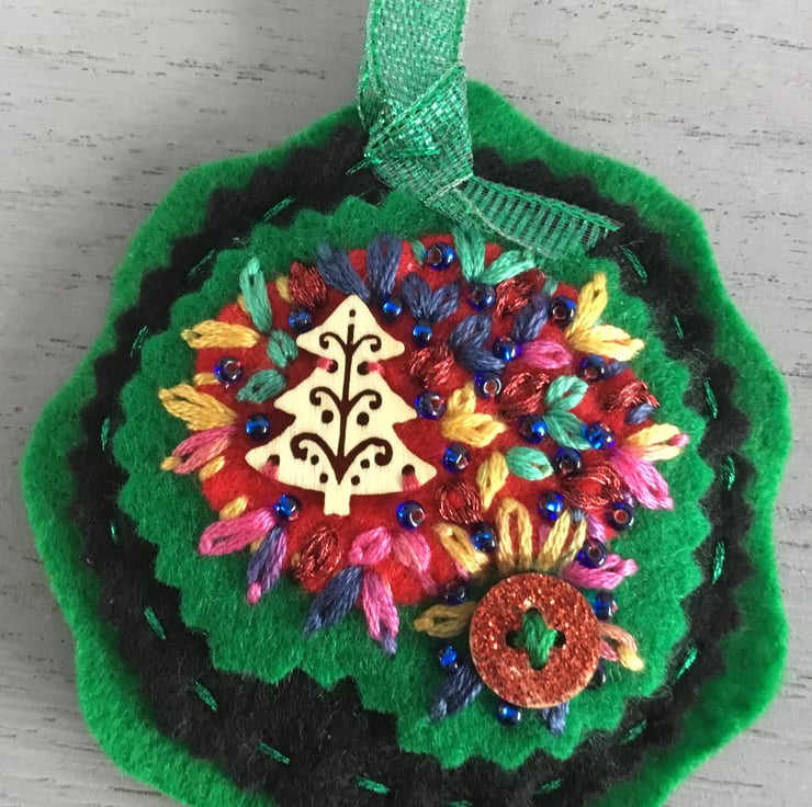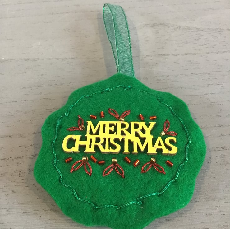 This double-sided Colourful Christmas Decoration is hand embroidered with two Christmas designs. A Christmas Tree Scene in the cheerful colours of Christmas on one side, a Christmas message ‘Merry Christmas’ on the other. The designs are hand embroidered on a background of green, red and black felt, with threads, beads and a glittering button in festive Christmas colours of red, gold, green and, dotted with blue and pink.