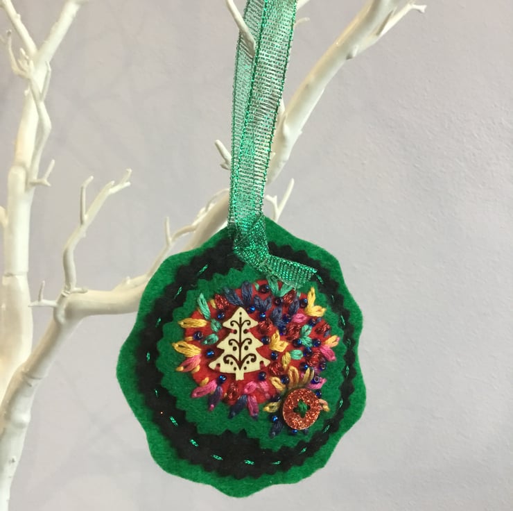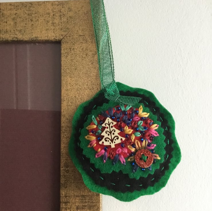 This Colourful Christmas Decoration has a long hanging loop in sparkling green ribbon. It’s ready to hang on a Christmas tree, door handle or picture frame or, to give as a small gift or a stocking filler....it’s light enough to post to a friend or relative.