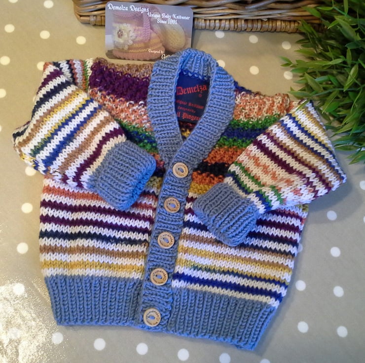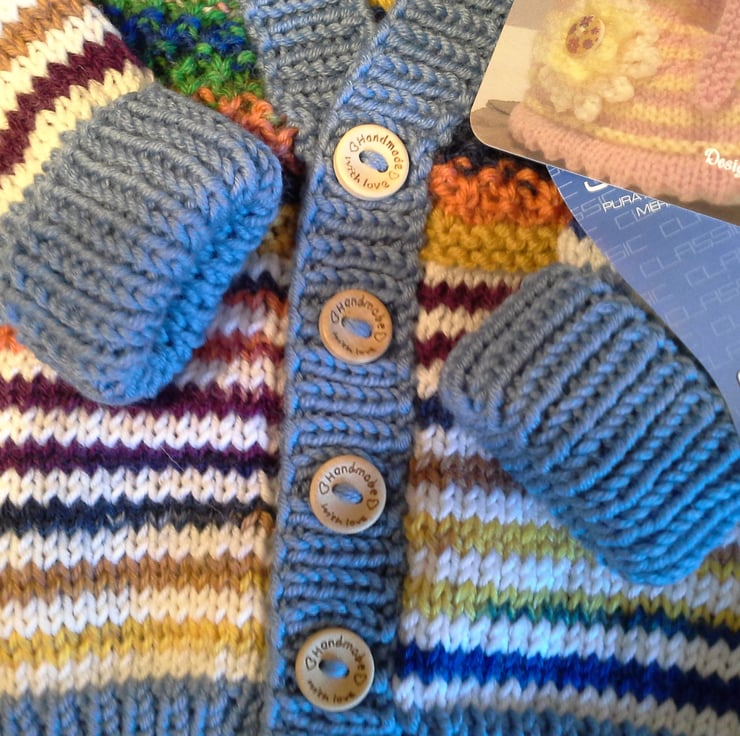 A beautiful eye catching unisex baby cardigan designed and lovingly hand crafted using super soft pure marino wool yarns from Italy. All yarns used are machine washable at low temperature settings. The buttons are made from genuine wood with a sweet sentiment burnt etched on them,.