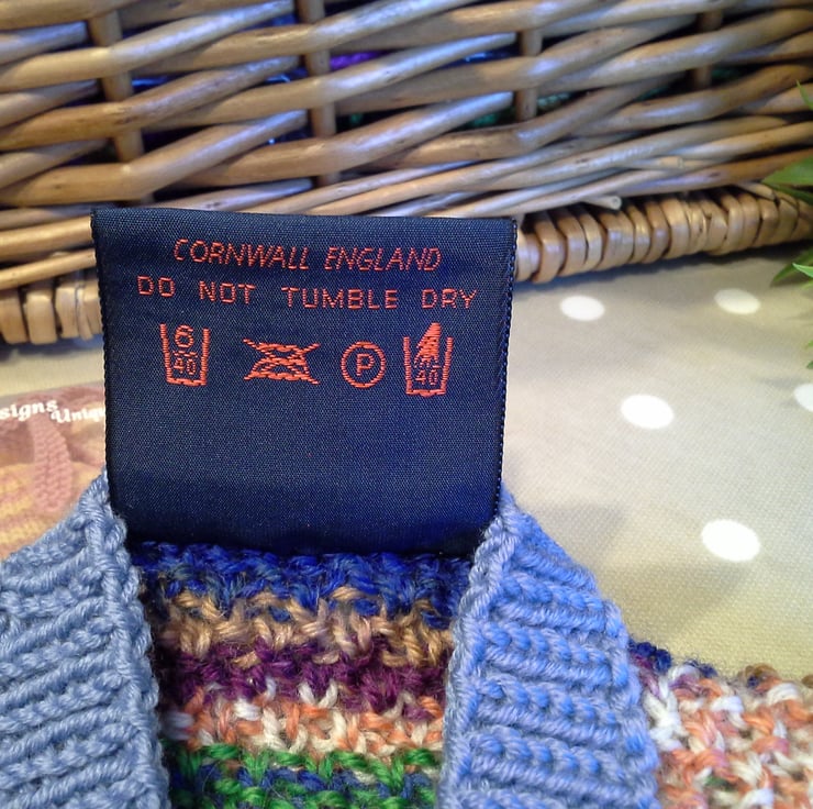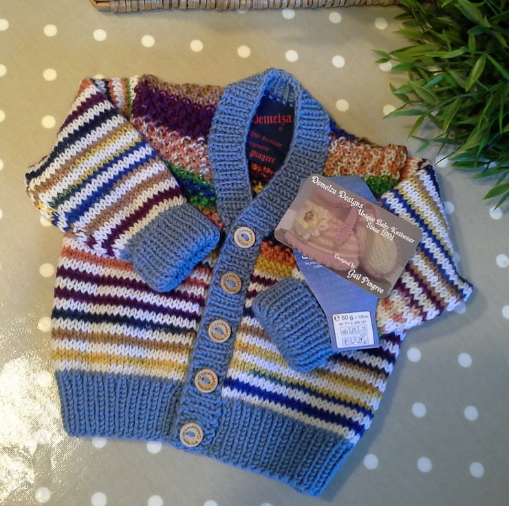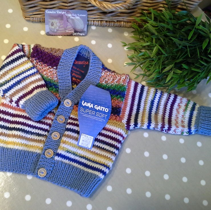 Baby knitwear is designed and hand crafted by Demelza Designs in Cornwall meeting UK baby safety standards, Only branded premuim acylic, acrylic/natural fibre blends or pure natural fibre yarns are used in baby knitwear which conforms to BS984/76 standards.