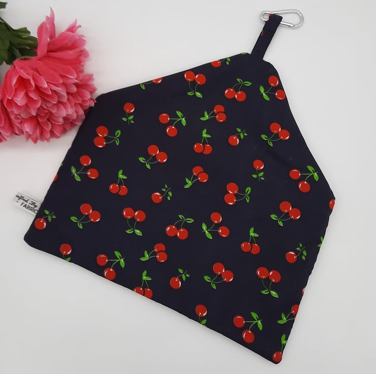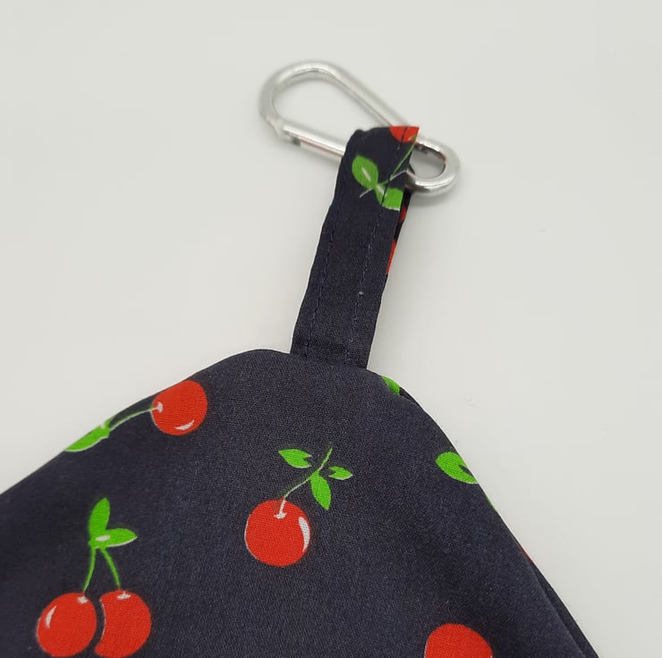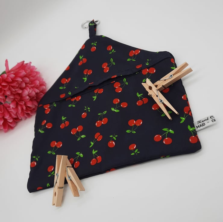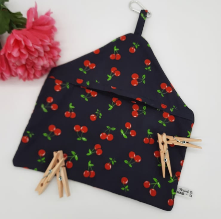 Peg bag made using a navy blue and cherry cotton fabric. Lined in navy cotton.
