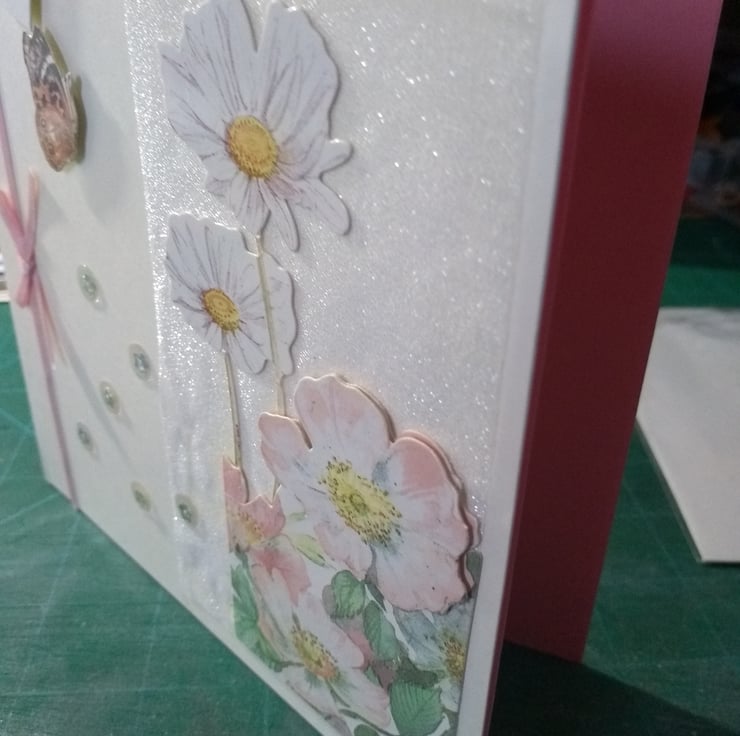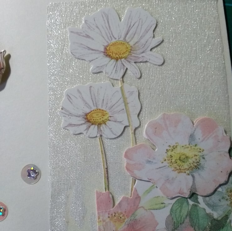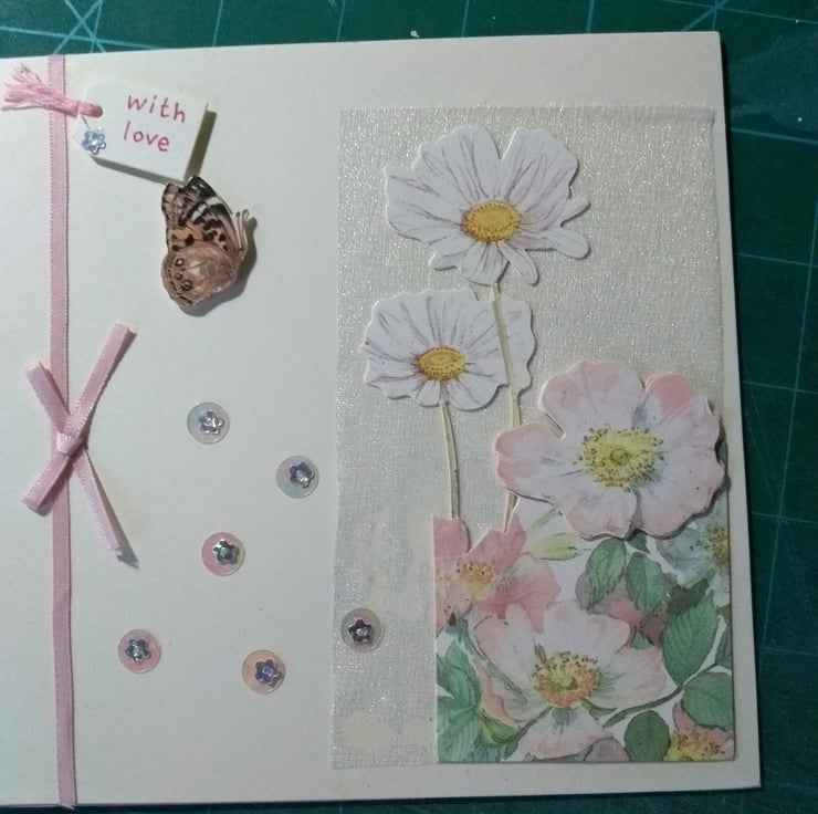 A completely handmade and uniquely designed card. Consisting of daisies and wild rose decoupage mounted onto silver net and then onto quality cream card. Embellished with butterfly, with love tag and sequins. Finished off with a pink ribbon and bow