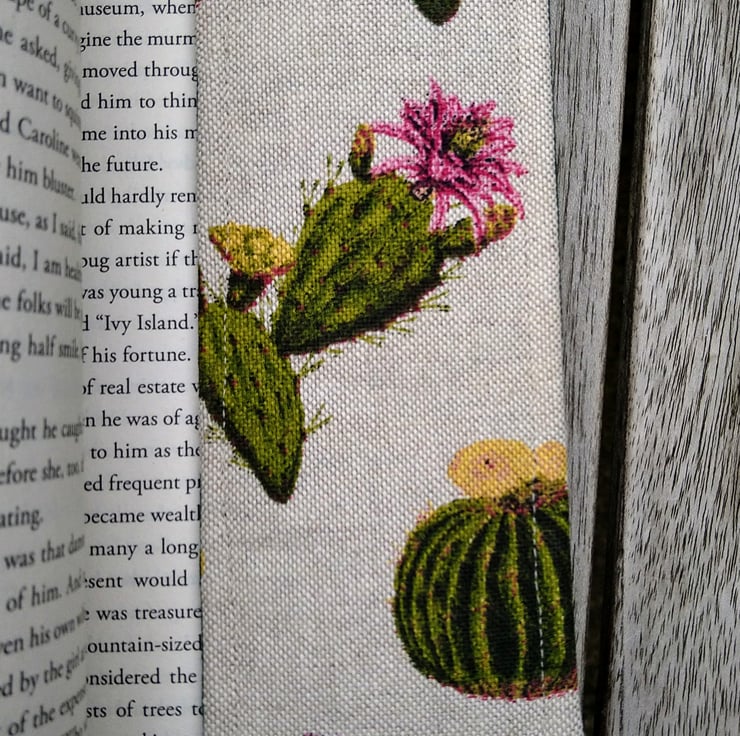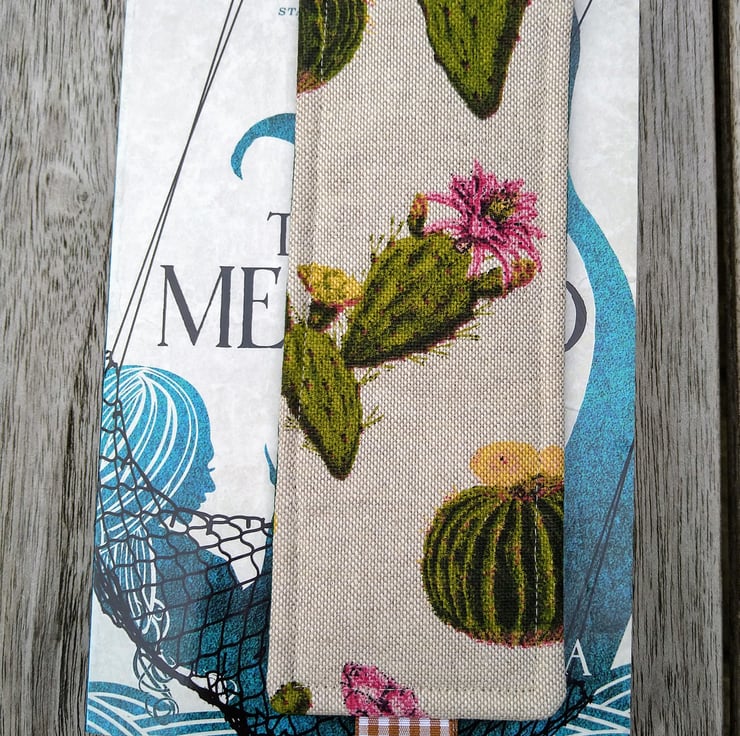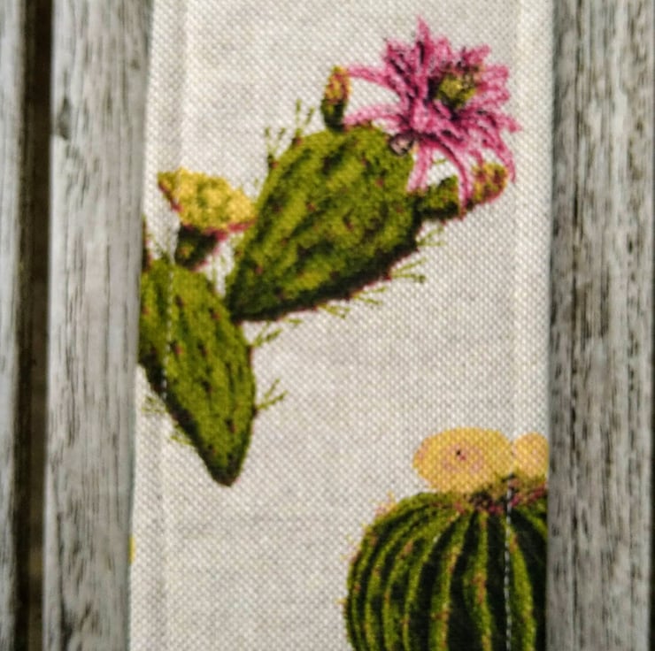 This is a handmade bookmark made with a linen blend fabric with a cactus design. It is padded with fusible fleece and the back is made with dark green cotton. There's a ribbon tag so you can find it in your book.