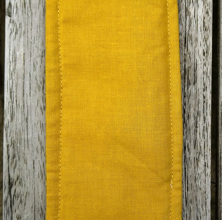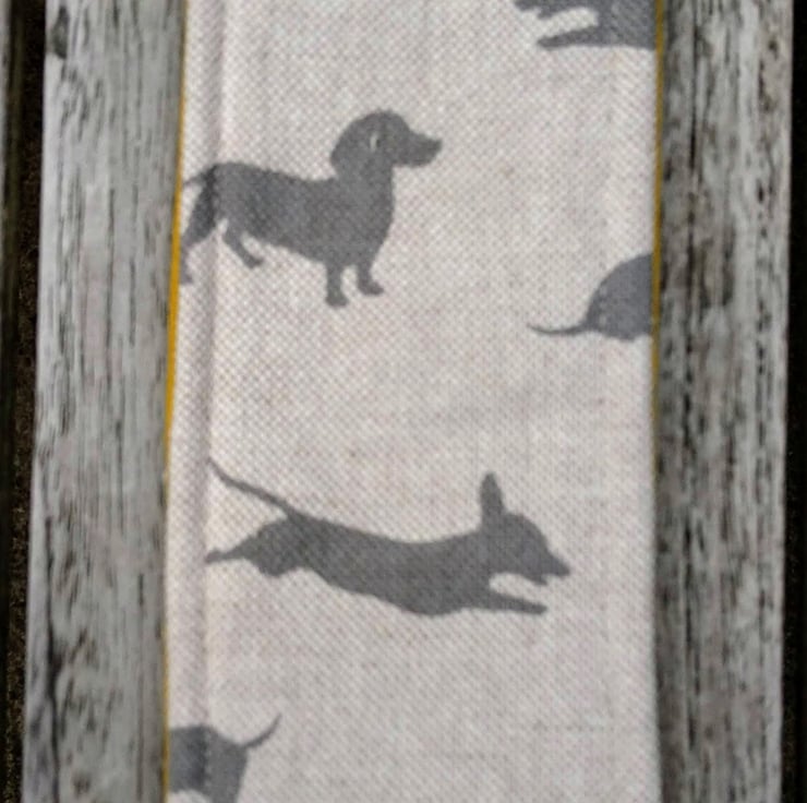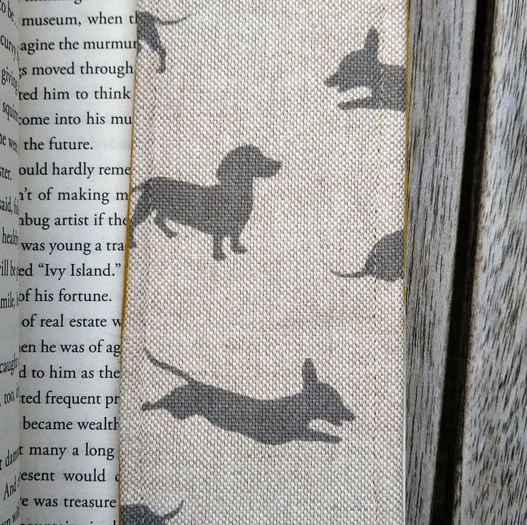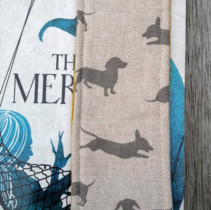 This is a handmade bookmark made with a linen blend fabric with a dachshund design. It is padded with fusible fleece and the back is made with mustard yellow cotton. There's a paw print ribbon tag so you can find it in your book. I have also top stitched all around the edge of the bookmark.