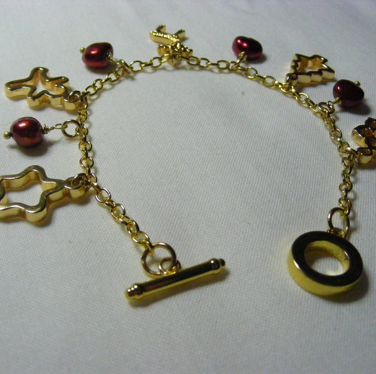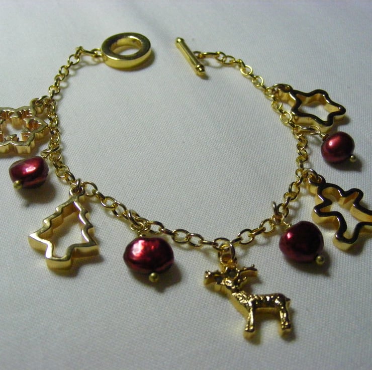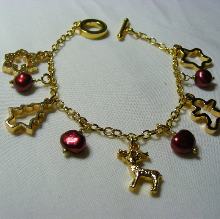 Bracelet is made with Christmas Charms and red Freshwater Pearls.