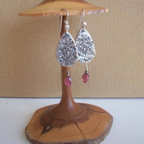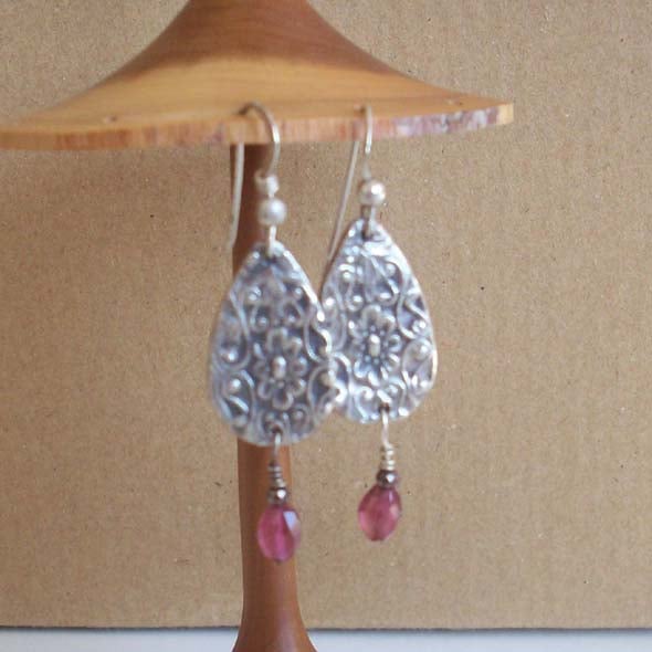 Fine silver Precious Metal Clay 99% pure earrings. Embossed pattern from a vintage source, oxidised for an antique appearance. Hooks are sterling silver. They are enhanced with beads of faceted rubellite, the pink version of Tourmaline and faceted tiny sparkle bronze coloured glass beads.Comes to you in a gift box. Please contact me regarding multiple postage or outside UK as prices vary.