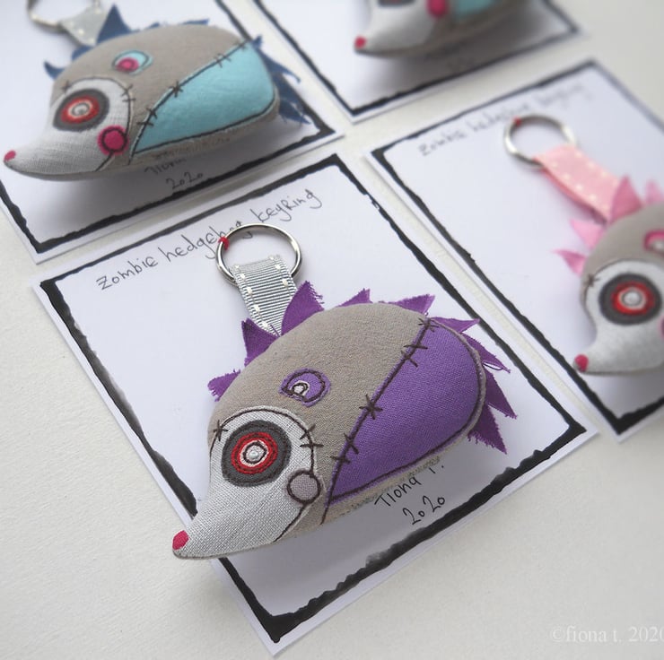 these spiky little fabric zombie hedgehogs measure about 9cm (3.5 inches) wide by 6cm (2.5”) tall - excluding spikes, hanging loop & split ring.