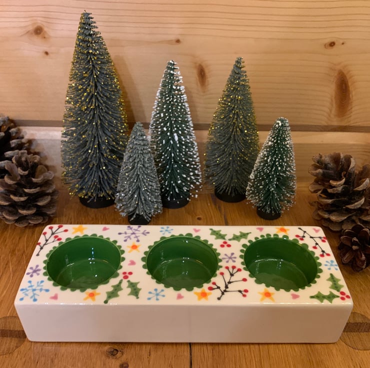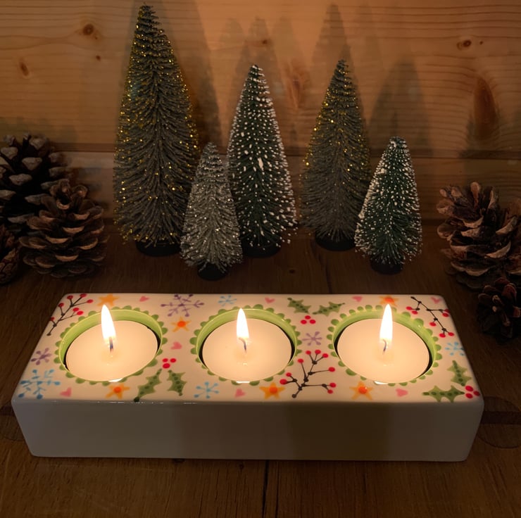 This triple tea light holder is made from white earthenware. Individually hand painted with a bright festive rainbow coloured confetti design in vibrant underglazes. It includes holly, snowflakes, stars, hearts, branches and berries.