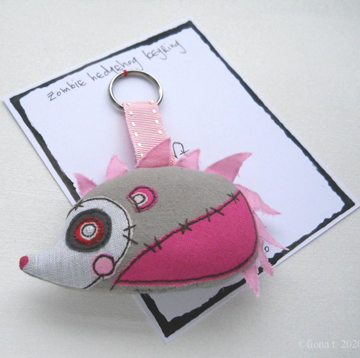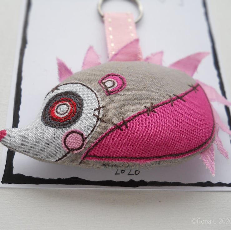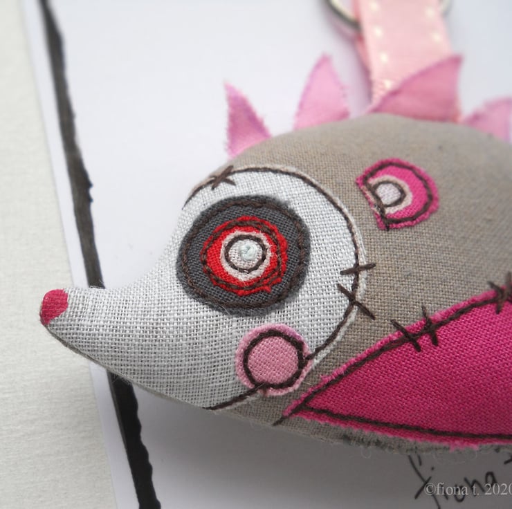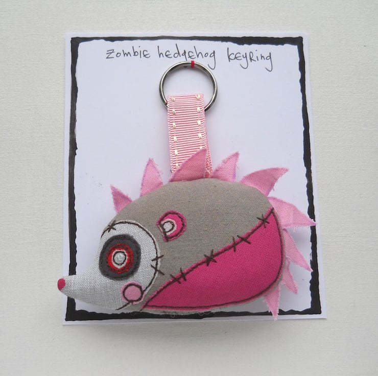 freehand embroidered zombie hedgehog bag charm or keyring - hot pink / candy pink.