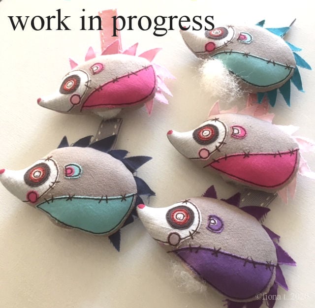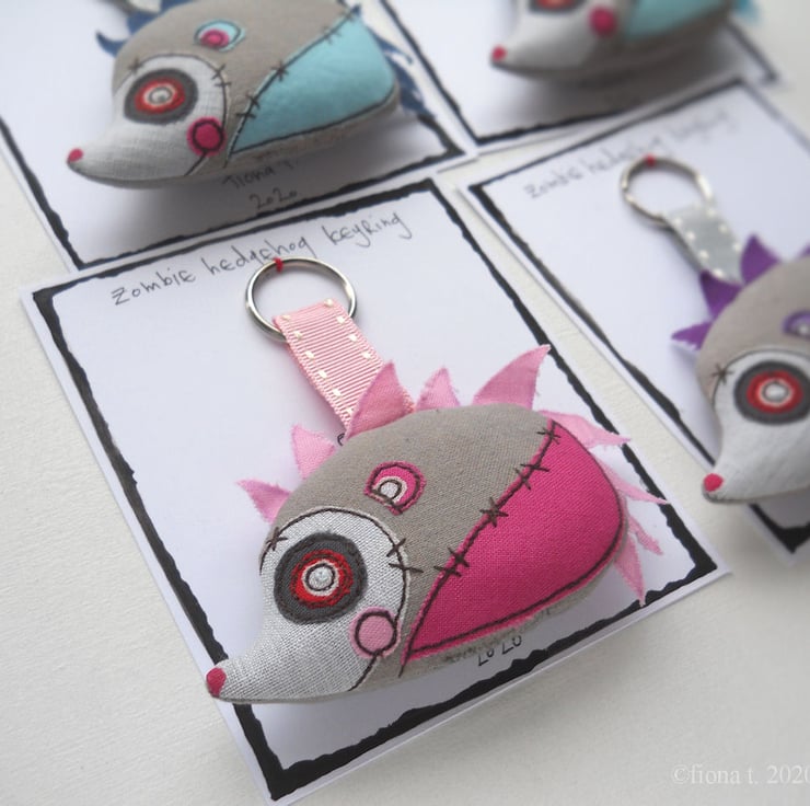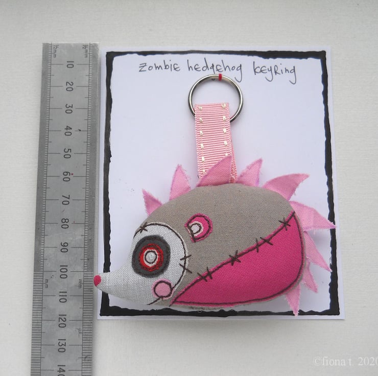 these spiky little fabric zombie hedgehogs measure about 9cm (3.5 inches) wide by 6cm (2.5”) tall - excluding spikes, hanging loop & split ring.