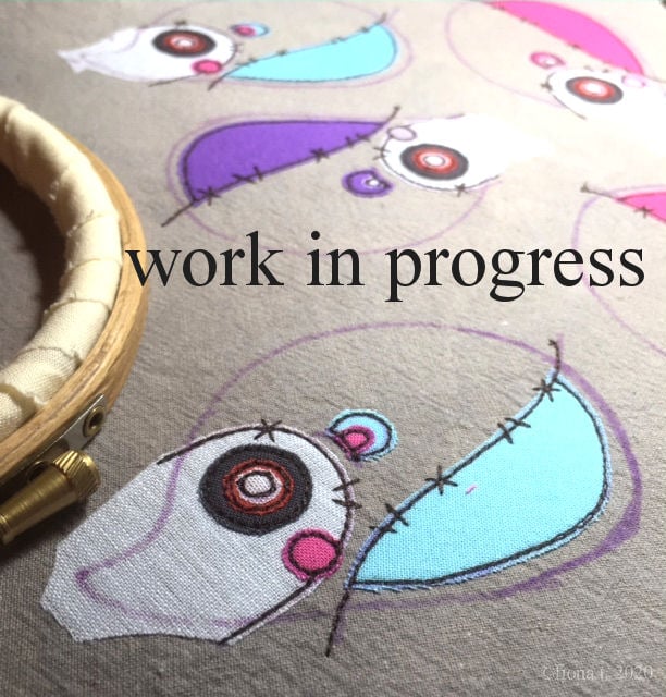 i’ve layered & appliqued pale blue irish linen, grey, and red and hot pink cotton fabrics onto hand dyed cotton calico. the intricate details are drawn freehand using free motion embroidery.