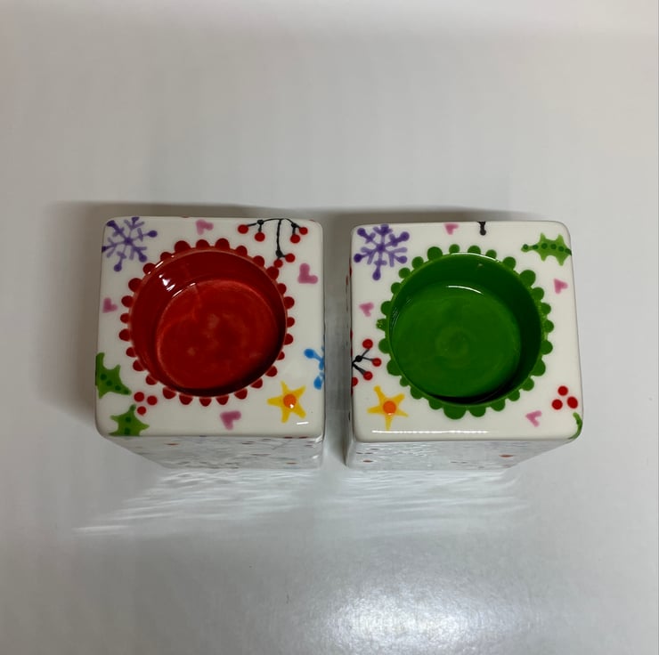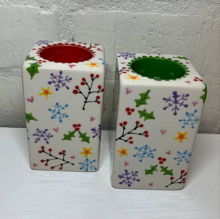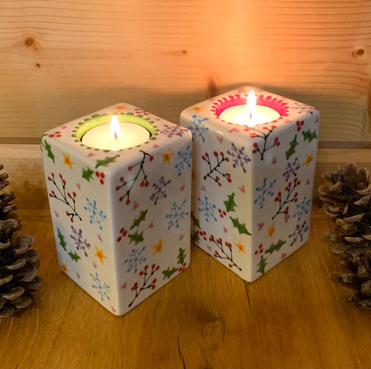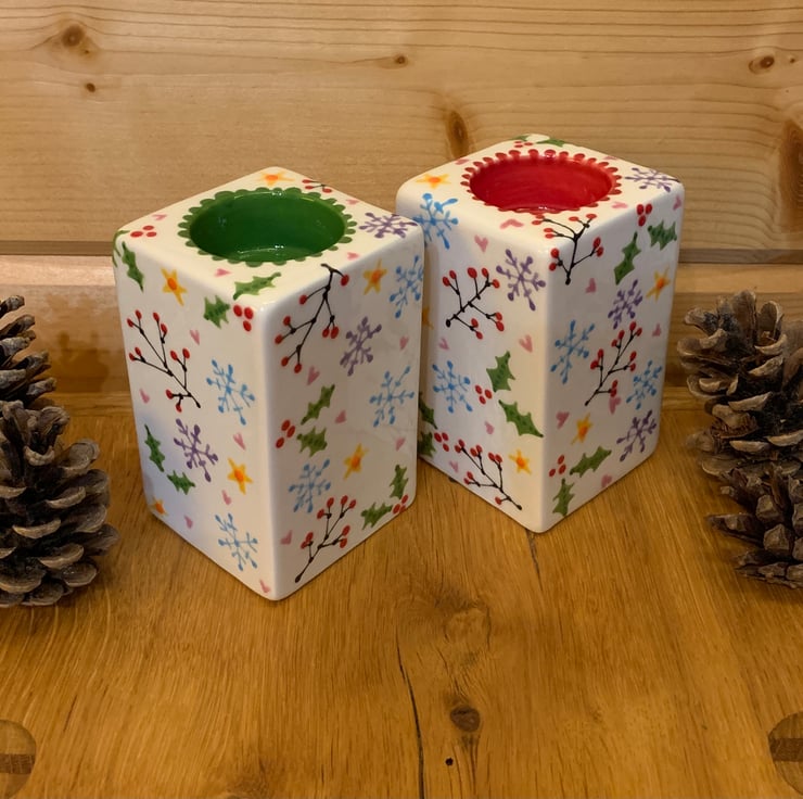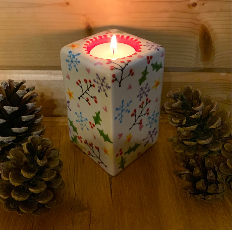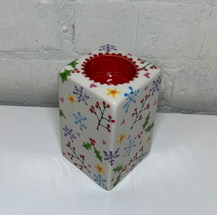 These tall tea light holders are made from white earthenware. Each one is hand painted with a bright festive rainbow coloured confetti design in vibrant underglazes. It includes holly, snowflakes, stars, hearts, branches and berries. Only available with red candle centre at present.