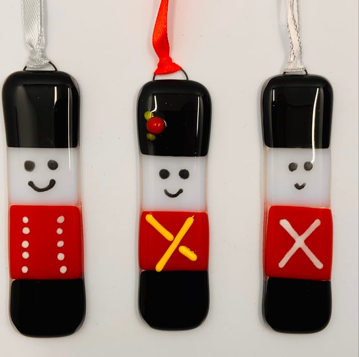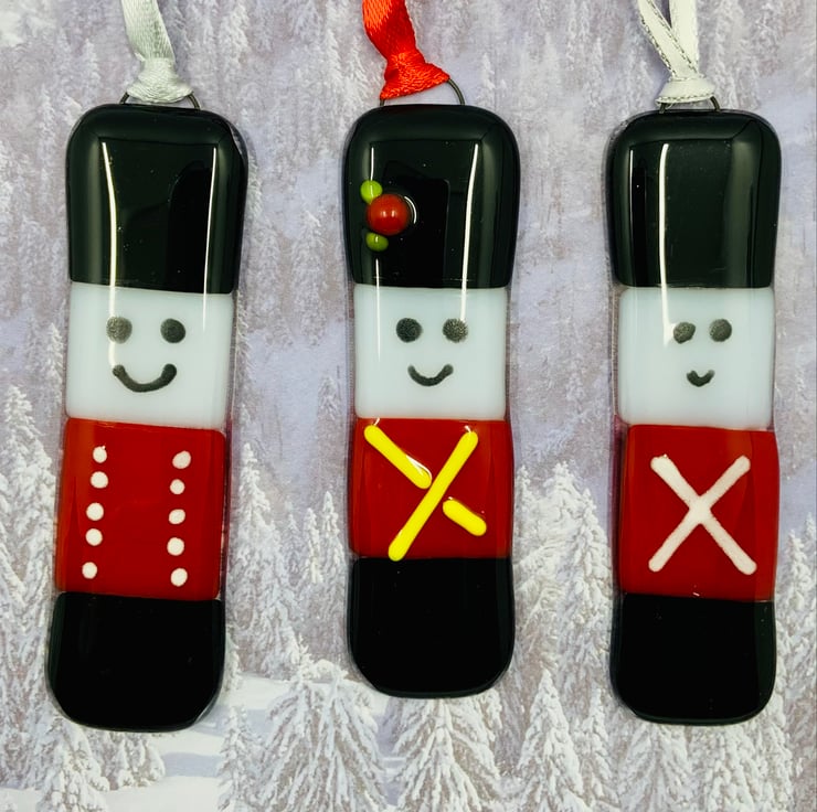 Three Handmade Fused Glass Soldier Hanging Christmas Decorations