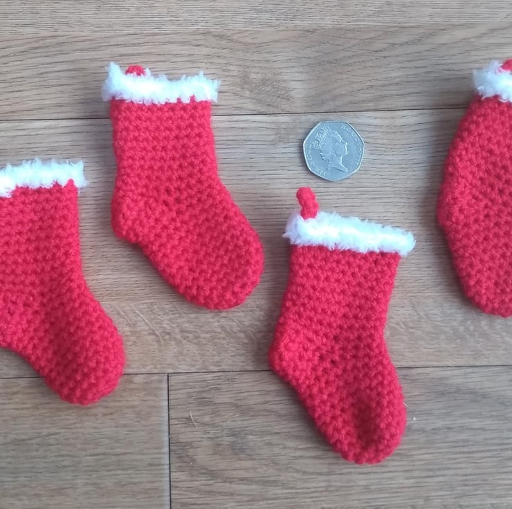 These cute crocheted Christmas stocking decorations are made from a lovely soft red acrylic yarn and have a fluffy white top and a small hanging loop. They measure approx. 11cm from top to toe and are 5cm wide across the top.