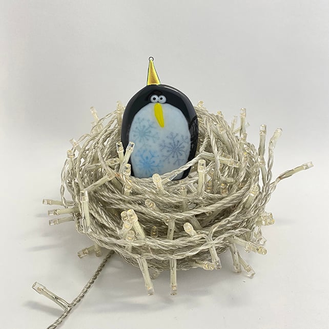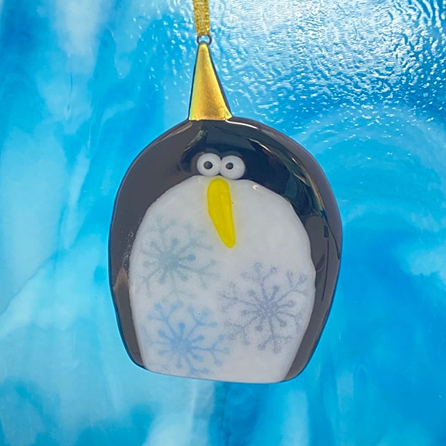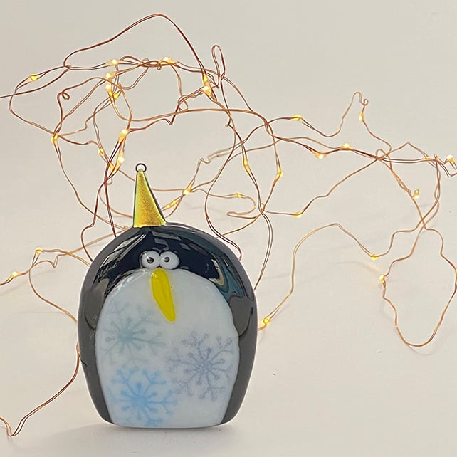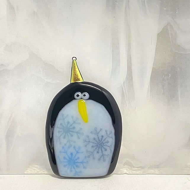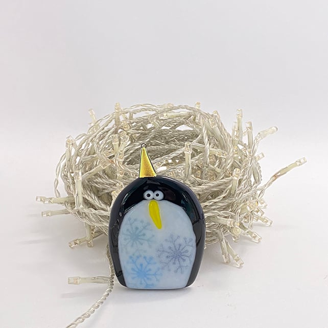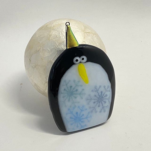 Created from layered Bullseye glass in my Whitstable workshop. This little fella has a delicate snowflake design on iridescent white using glass powders and a gold bling party hat.