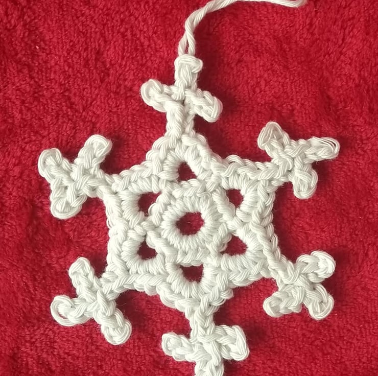 These snowflakes are crocheted in a thick natural coloured cotton yarn, they measure approx.11 cm from top to bottom and come with a loop to hang them on a Christmas tree or at a window.
