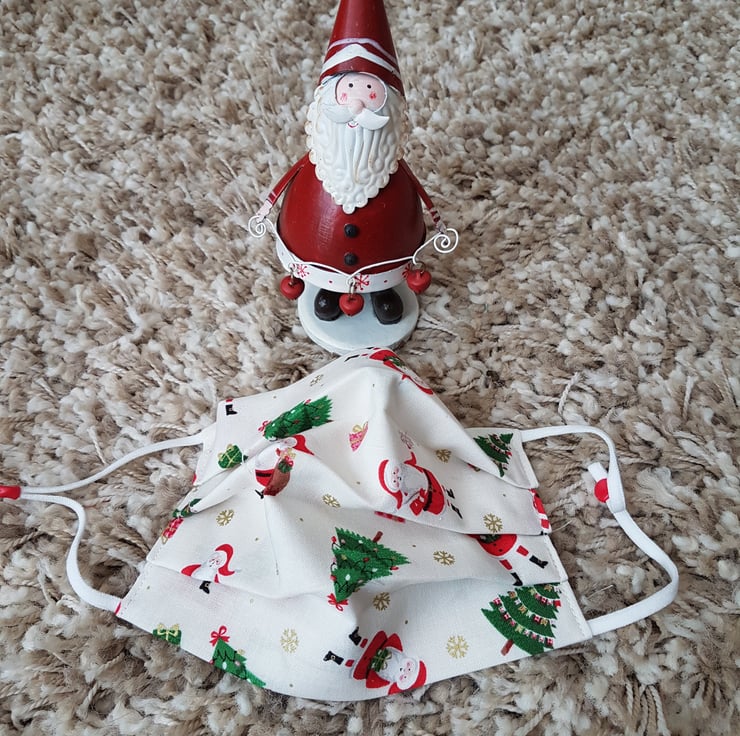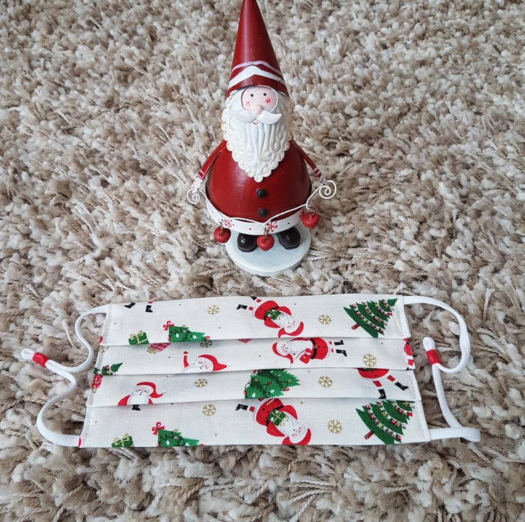 Small Adult/Teenager festive face covering made from a Santa and Christmas tree print. The face mask is made with 2 layers of cotton forming an inner pocket for a filter (not included) and is fastened over the ears with 2 loops of elastic and a toggle adjuster.