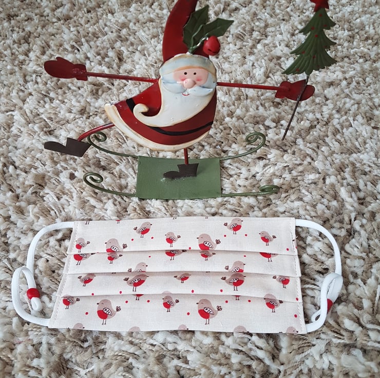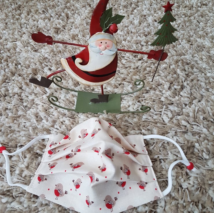 Adult festive face covering made from a robin and spot print. The face mask is made with 2 layers of cotton forming an inner pocket for a filter (not included) and is fastened over the ears with 2 loops of elastic and a toggle adjuster.