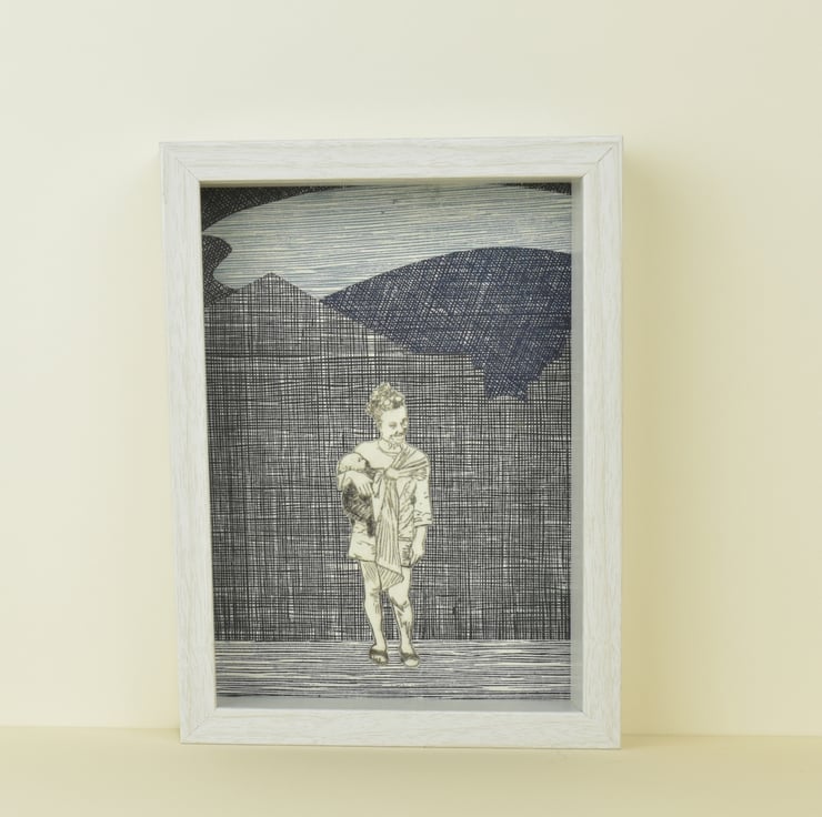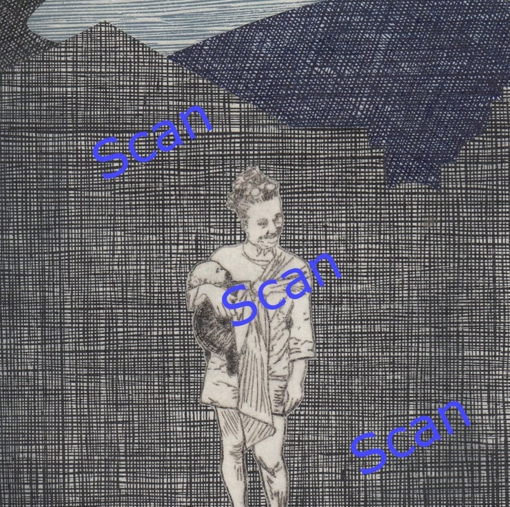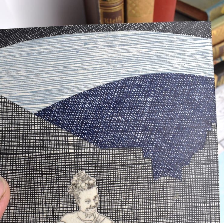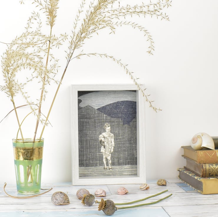 While there are five of these drypoint etchings, the collaged background and overall make-up is unique to each of them, making this a one of a kind picture.
