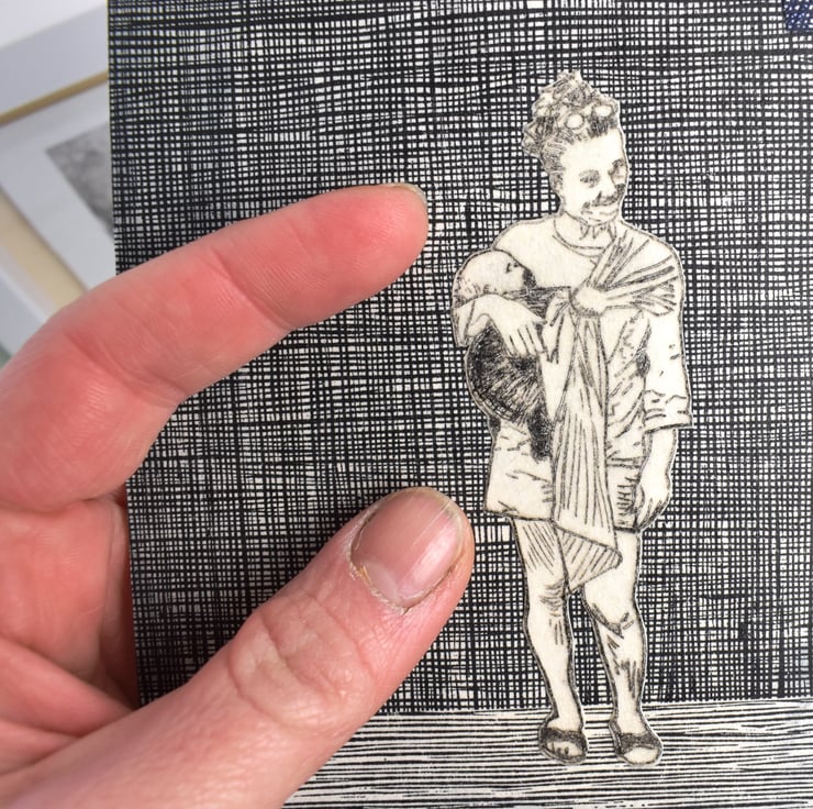 I made a drypoint etching of a women carrying her infant in a sling (this is 2 of five) which I cut out and collaged onto a background that is collaged together from several lino-prints. The collage is sealed with a shellac.