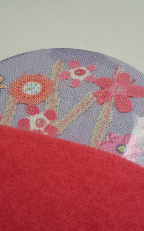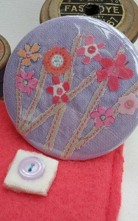 The 'Flower Meadow' design has been individually hand cut and stitched from cotton fabrics onto a lilac linen background and a clear protective backing added so it can be wiped clean. The metal rimmed mirror measures 58mm diameter and comes with its own pouch with button detail. (as shown)