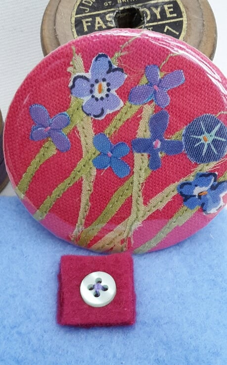 The 'Flower Meadow' design has been individually hand cut and stitched from cotton fabrics onto a pink-red- cerise linen background and a clear protective backing added so it can be wiped clean. The metal rimmed mirror measures 58mm diameter and comes with its own pouch with button detail. (as shown)