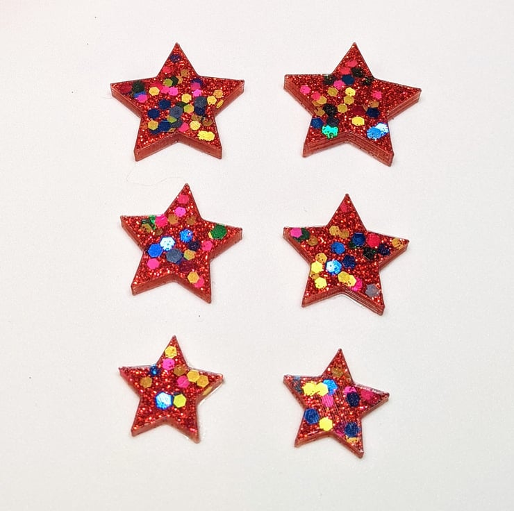 Glittering red, with a sprinkle of pink, blue, yellow and green, finished with a high gloss varnish.
