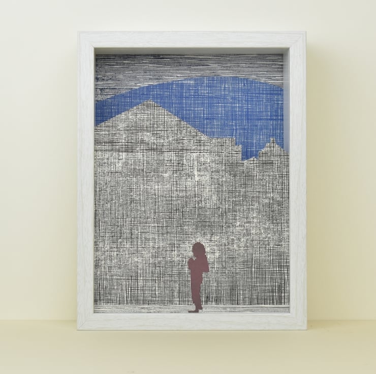 This picture is made up of three panels arranged in two layers within a shadow frame. In the front we see the cut-out silhouette of a mother carrying an infant in a sling and looking down at her. If you look closely you can see a printed woven pattern on her, too.
