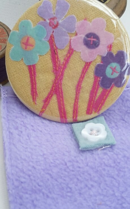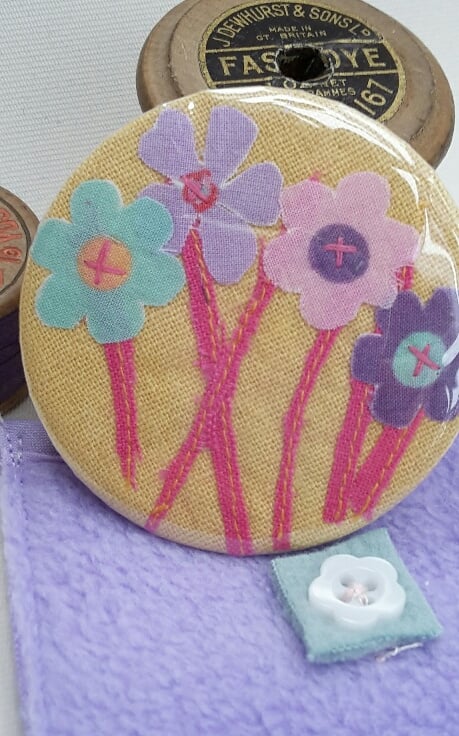 The 'Cut Flowers' design has been individually hand cut and stitched from cotton fabrics onto a yellow linen background and a clear protective backing added so it can be wiped clean. The metal rimmed mirror measures 58mm diameter and comes with its own pouch with button detail. (as shown)