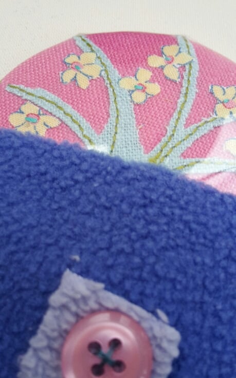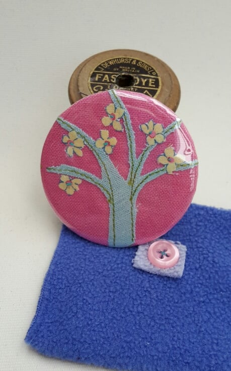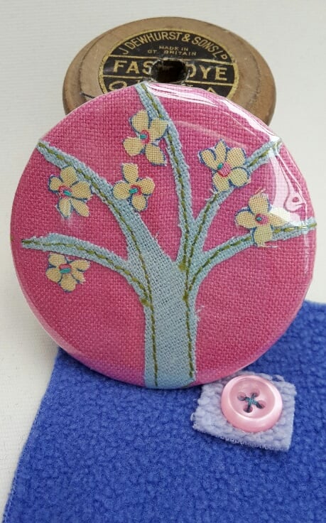 The 'Blossom Tree' design has been individually hand cut and stitched from cotton fabrics onto a pink linen background and a clear protective backing added so it can be wiped clean. The metal rimmed mirror measures 58mm diameter and comes with its own pouch with button detail. (as shown)