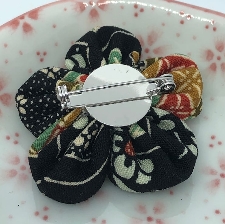 This brooch of a kanzashi inspired plum blossom flower is made with recycled kimono fabric, sewn and glued, with a silver tone brooch back.