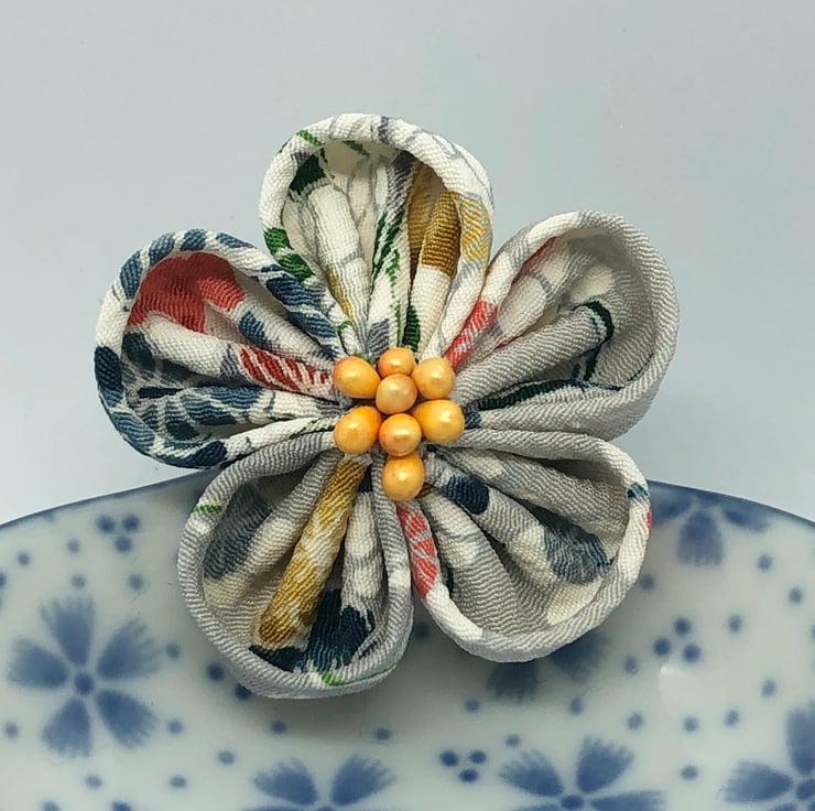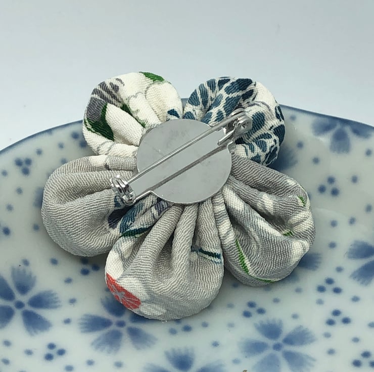 This brooch of a kanzashi inspired plum blossom flower is made with recycled kimono fabric, sewn and glued, with a silver tone brooch back.