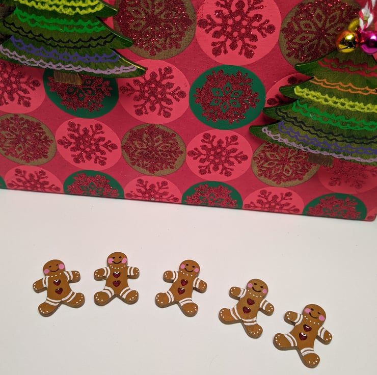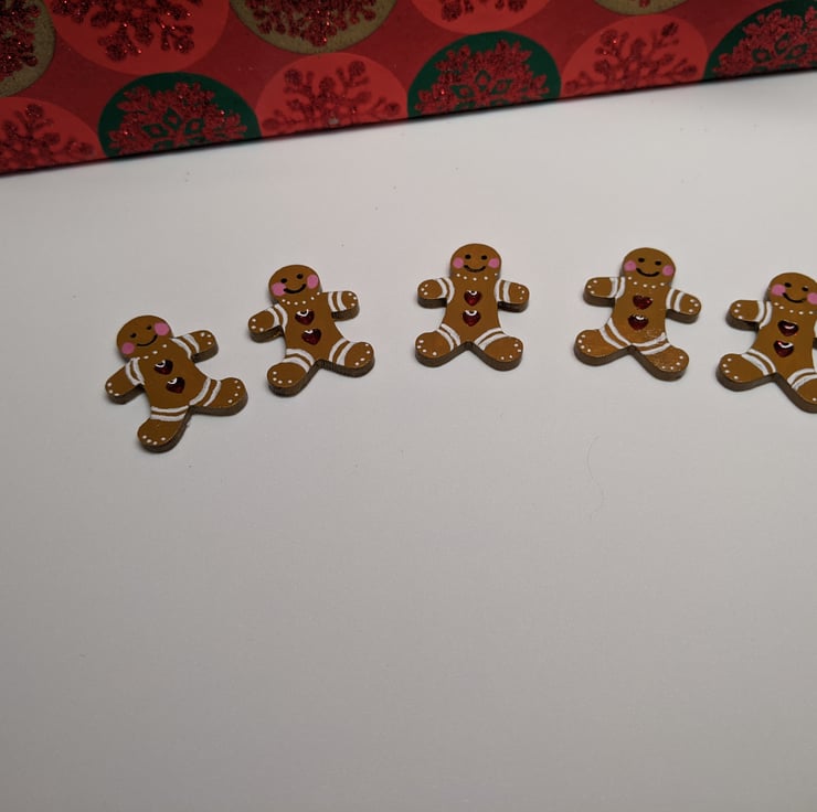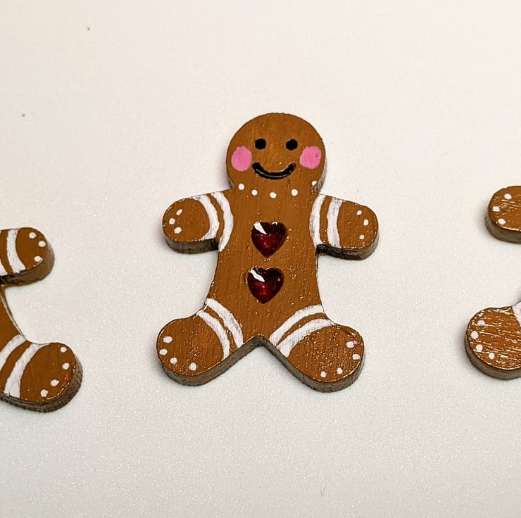 Cute gingerbread folk made from sustainably sourced birchwood, painted and given jammy red resin buttons and details!