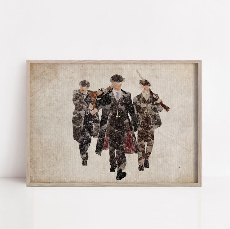 Shelby Boys, inspired by the hit TV show Peaky Blinders this print shows John, Arthur, and Tommy Shelby is their usual attire.