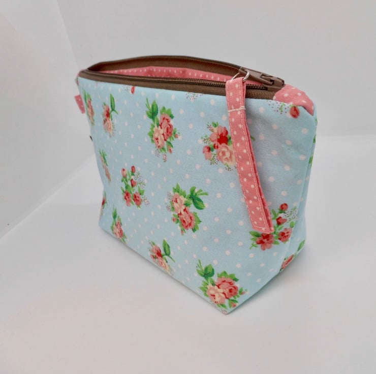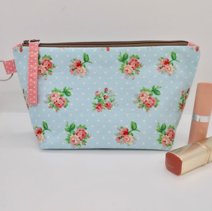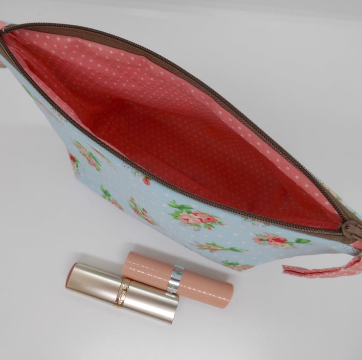 Large size make up bag is lined and trimmed with pink and white spot quilting cotton. Key ring tab in one side seam to add keys, a charm, or to clip safety inside your bag. The beige zip across the top is finished with a fabric tab. Bag measures about 22cm x 12cm and I have boxed the base so that it stands up on it's own.