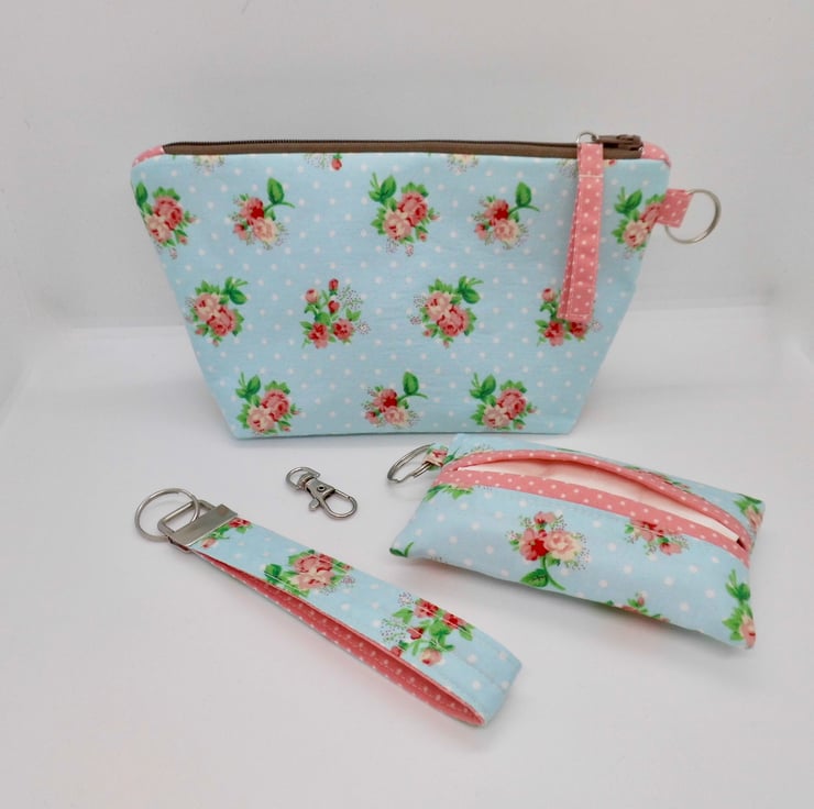 This set is made using two quilting cottons in coordinating prints. The main fabric of blue with pink rose posies has been backed with fusible fleece to give it a quality feel and maintain shape.