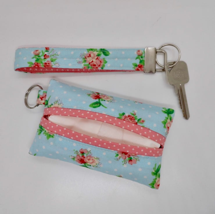 Third item is a pocket tissue holder which features a key ring and will come complete with a new pack of tissues. Again, fabric has been backed with fusible fleece and lined with pink and white quilting cotton.