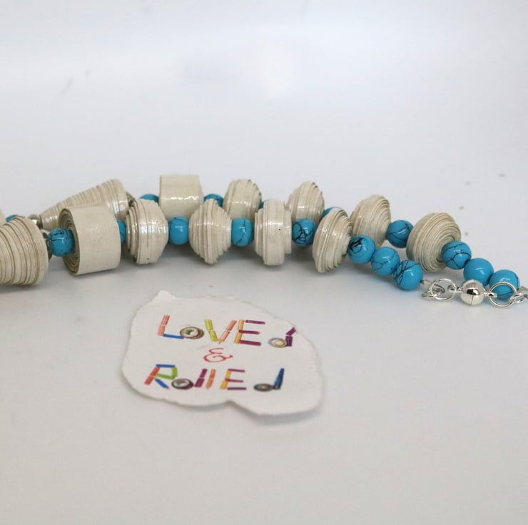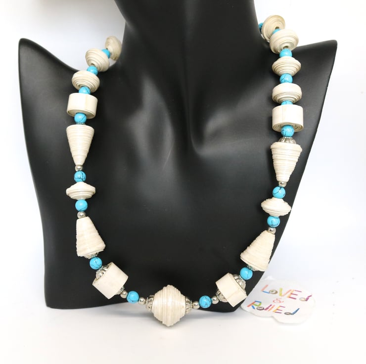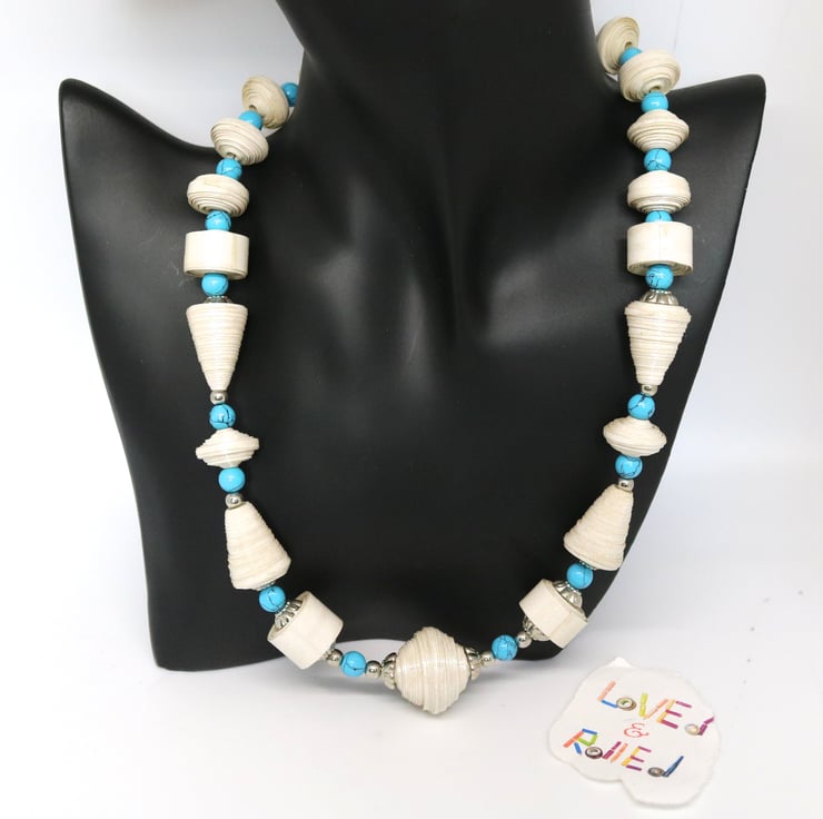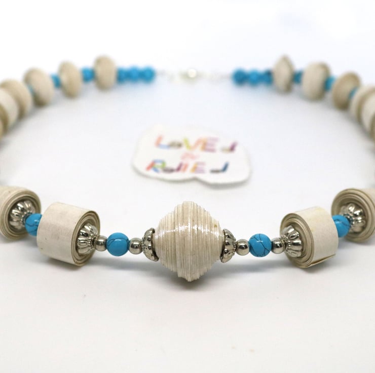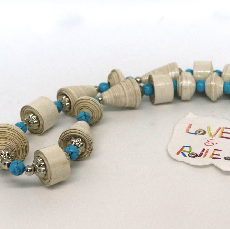 One of kind, statement necklace. Made with unwanted cream wall paper which was cut into strips, handrolled into beads then varnished. Complemented with recycled sky blue patterned round beads and ornate silvery bead ends.