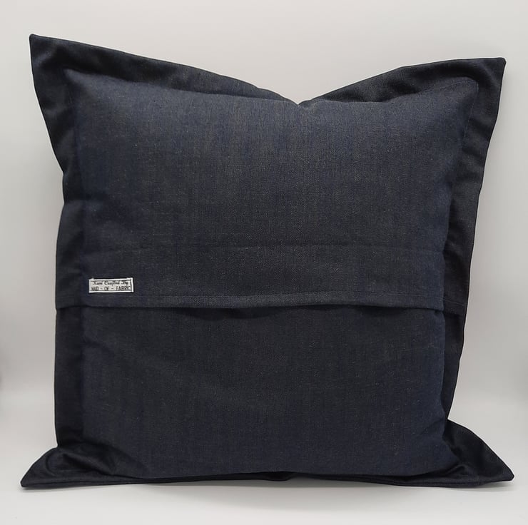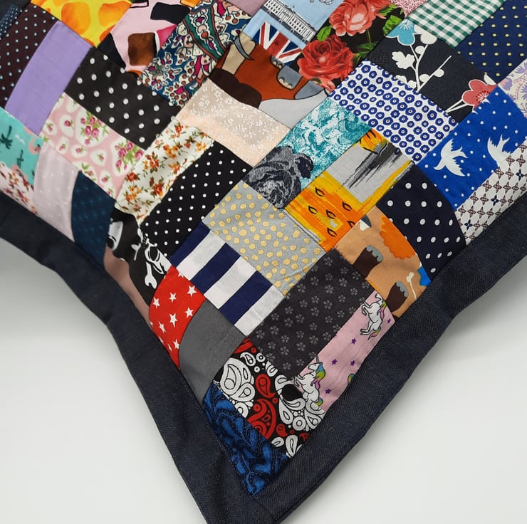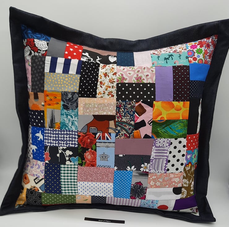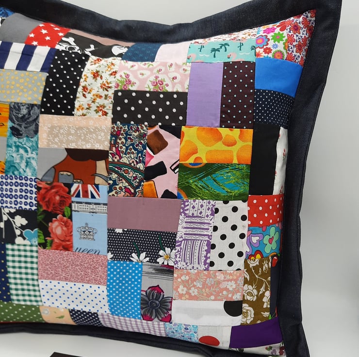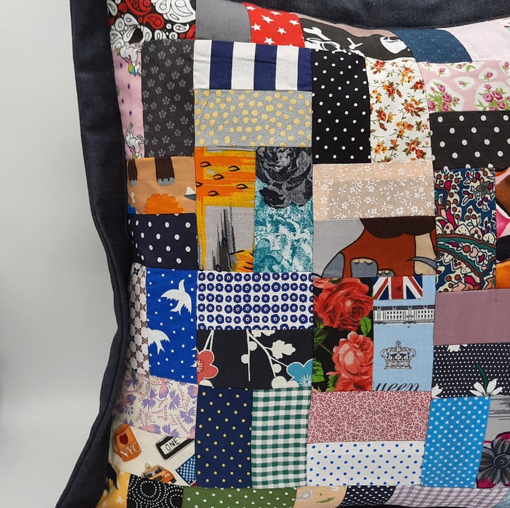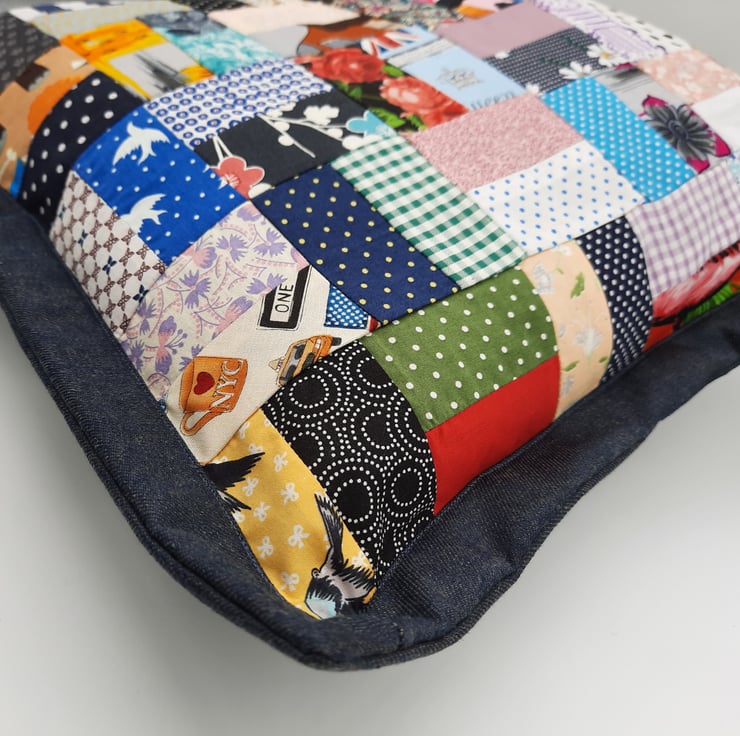 Denim backed patchwork cushion. All of the patches are different and include a wide variety of colours.