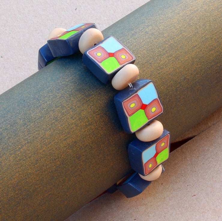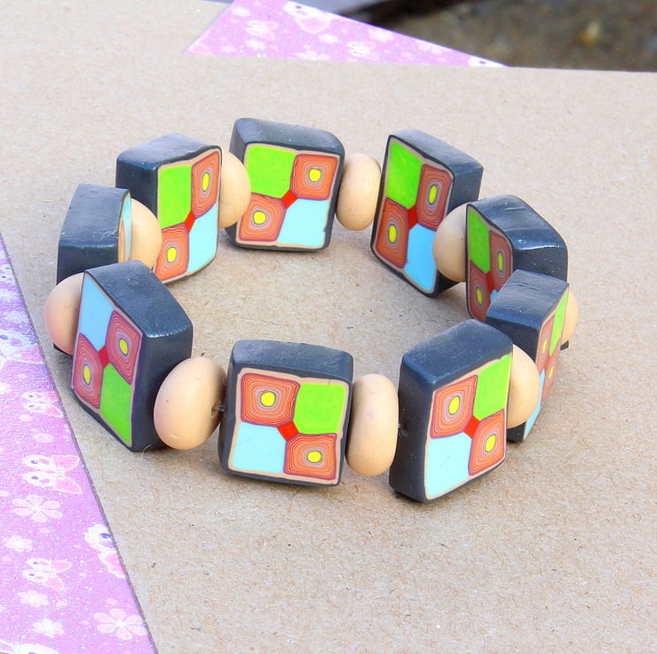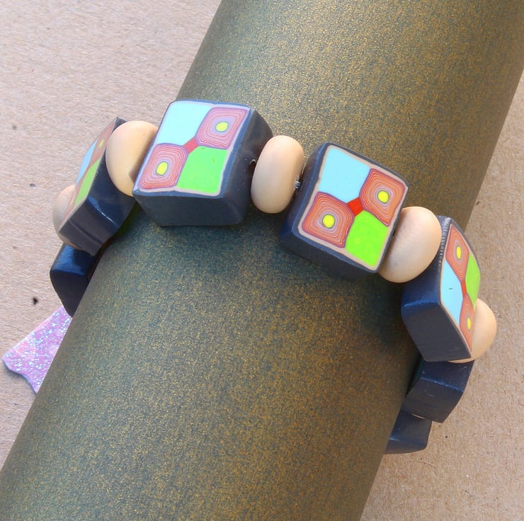 An unusual, eye-catching bracelet of hand crafted, delicately patterned tiles. These are crafted, by myself, from polymer clay. This is excellent, hard-wearing- lightweight stuff that will keep those lovely tones forever. They are threaded onto high quality elastic, unbreakable !.